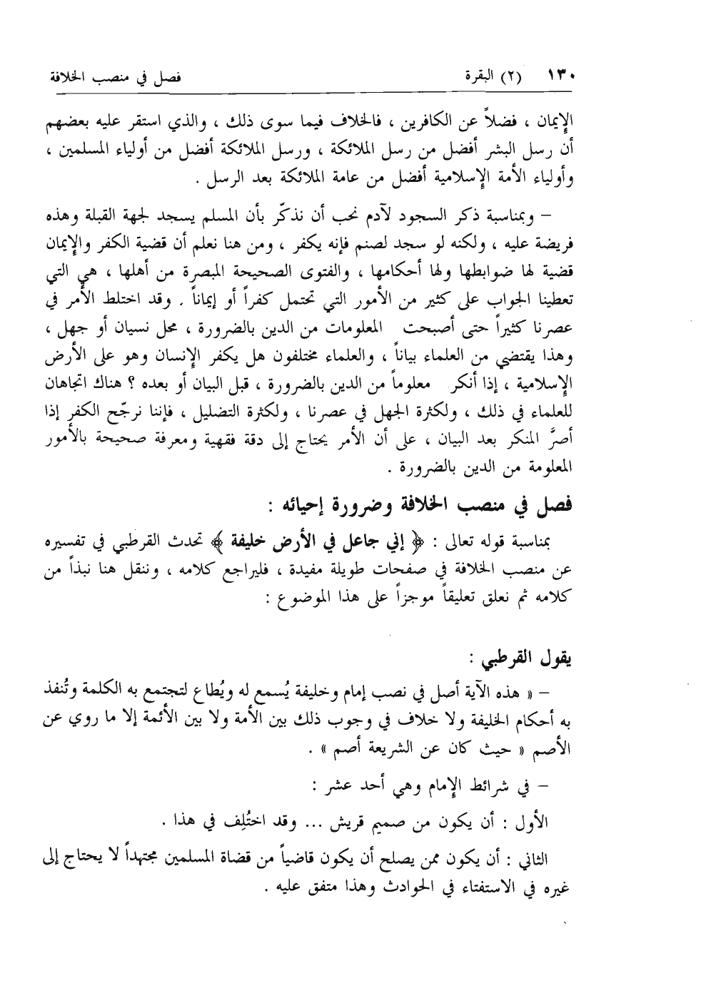 بمناسبة قوله تعالى: إِنِّي جاعِلٌ فِي الْأَرْضِ خَلِيفَةً تحدث القرطبي في تفسيره عن منصب الخلافة في صفحات طويلة مفيدة، فليراجع كلامه، وننقل هنا نبذا من كلامه ثم نعلق تعليقا موجزا على هذا الموضوع: