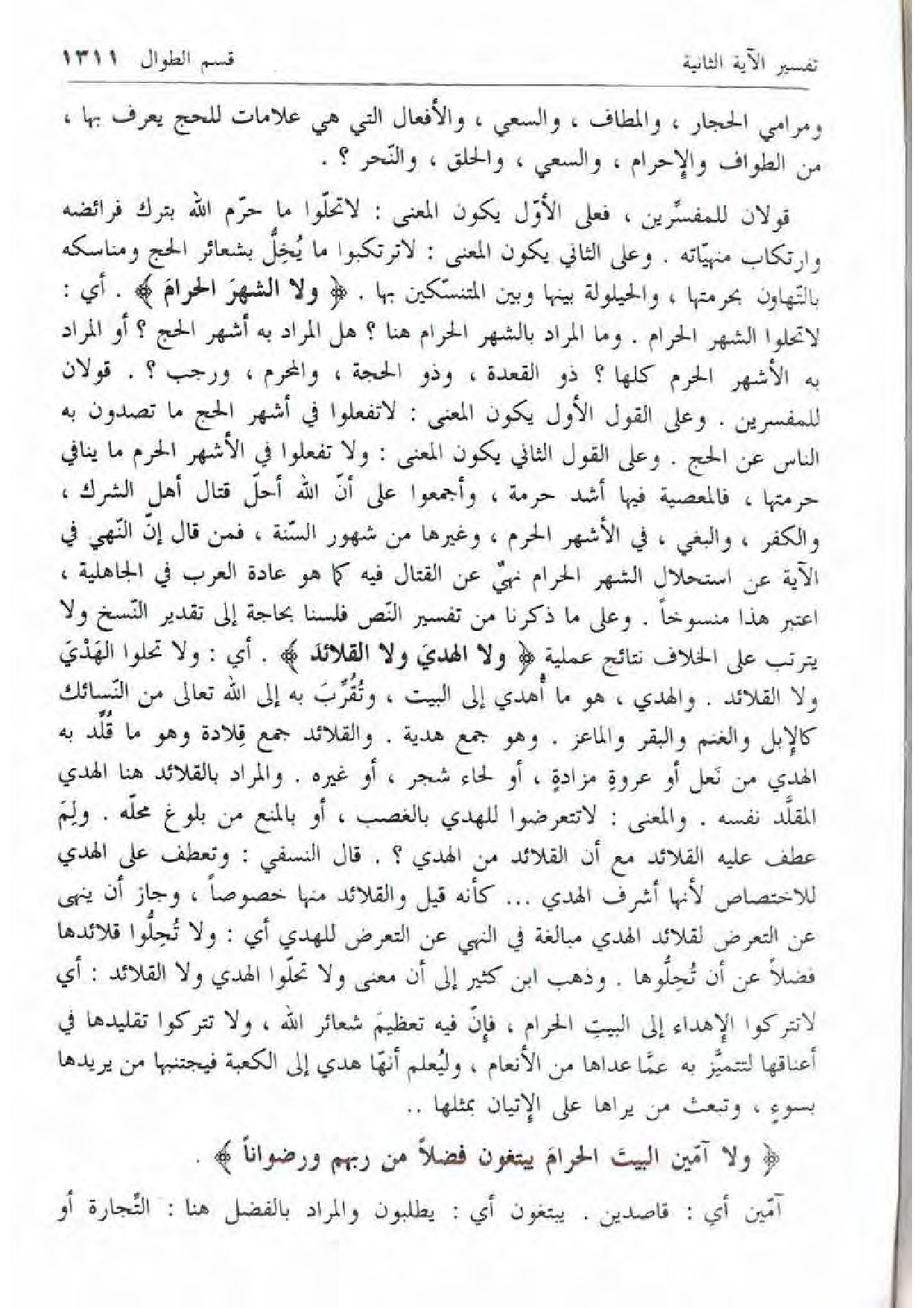 لا تحلوا الشهر الحرام. وما المراد بالشهر الحرام هنا؟ هل المراد به أشهر الحج؟ أو المراد به الأشهر الحرم كلها؟ ذو القعدة، وذو الحجة، والمحرم، ورجب؟. قولان للمفسرين. وعلى القول الأول يكون المعنى: لا تفعلوا في أشهر الحج ما تصدون به الناس عن الحج. وعلى القول الثاني يكون المعنى: ولا تفعلوا في الأشهر الحرم ما ينافي حرمتها، فالمعصية فيها أشد حرمة، وأجمعوا على أنّ الله أحلّ قتال أهل الشرك، والكفر، والبغي، في الأشهر الحرم، وغيرها من شهور السّنة، فمن قال إنّ النّهي في الآية عن استحلال الشهر الحرام نهي عن القتال فيه كما هو عادة العرب في الجاهلية، اعتبر هذا منسوخا. وعلى ما ذكرنا من تفسير النّص فلسنا بحاجة إلى تقدير النّسخ ولا يترتب على الخلاف نتائج عملية وَلَا الْهَدْيَ وَلَا الْقَلائِدَ. أي: ولا تحلوا الهدي ولا القلائد. والهدي، هو ما أهدي إلى البيت، وتقرّب به إلى الله تعالى من النّسائك