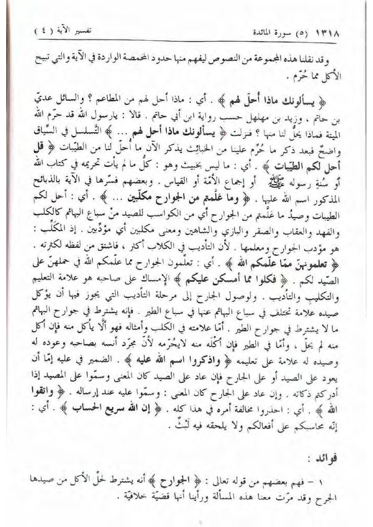 تُعَلِّمُونَهُنَّ مِمَّا عَلَّمَكُمُ اللَّهُ. أي: تعلّمون الجوارح مما علّمكم الله في حملهنّ على الصّيد لكم. فَكُلُوا مِمَّا أَمْسَكْنَ عَلَيْكُمْ الإمساك على صاحبه هو علامة التعليم والتكليب والتأديب. ولوصول الجارح إلى مرحلة التأديب التي يجوز فيها أن يؤكل صيده علامة تختلف في سباع البهائم عنها في سباع الطير. فإنه يشترط في جوارح البهائم ما لا يشترط في جوارح الطير. أمّا علامته في الكلب وأمثاله فهو ألّا يأكل منه فإن أكل منه لم يحلّ، وأمّا في الطير فإن أكله منه لا يحرّمه لأنّ مجرّد أنسه بصاحبه وعوده له وصيده له علامة على تعليمه وَاذْكُرُوا اسْمَ اللَّهِ عَلَيْهِ. الضمير في عليه إمّا أن يعود على الصيد أو على الجارح فإن عاد على الصيد كان المعنى وسمّوا على المصيد إذا أدركتم ذكاته. وإن عاد على الجارح كان المعنى: وسمّوا عليه عند إرساله. وَاتَّقُوا اللَّهَ. أي: احذروا مخالفة أمره في هذا كله. إِنَّ اللَّهَ سَرِيعُ الْحِسابِ. أي: