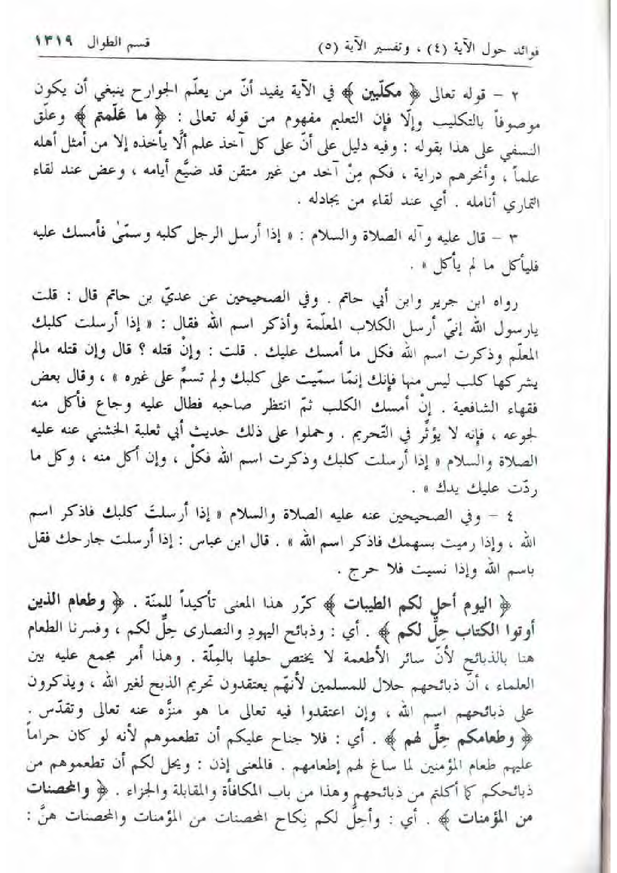 رواه ابن جرير وابن أبي حاتم. وفي الصحيحين عن عديّ بن حاتم قال: قلت يا رسول الله إنّي أرسل الكلاب المعلّمة وأذكر اسم الله فقال: «إذا أرسلت كلبك المعلّم وذكرت اسم الله فكل ما أمسك عليك. قلت: وإن قتله؟ قال وإن قتله ما لم يشركها كلب ليس منها فإنك إنمّا سمّيت على كلبك ولم تسمّ على غيره»، وقال بعض فقهاء الشافعية. إن أمسك الكلب ثمّ انتظر صاحبه فطال عليه وجاع فأكل منه لجوعه، فإنه لا يؤثّر في التّحريم. وحملوا على ذلك حديث أبي ثعلبة الخشني عنه عليه الصلاة والسلام «إذا أرسلت كلبك وذكرت اسم الله فكل، وإن أكل منه، وكل ما ردّت عليك يدك».