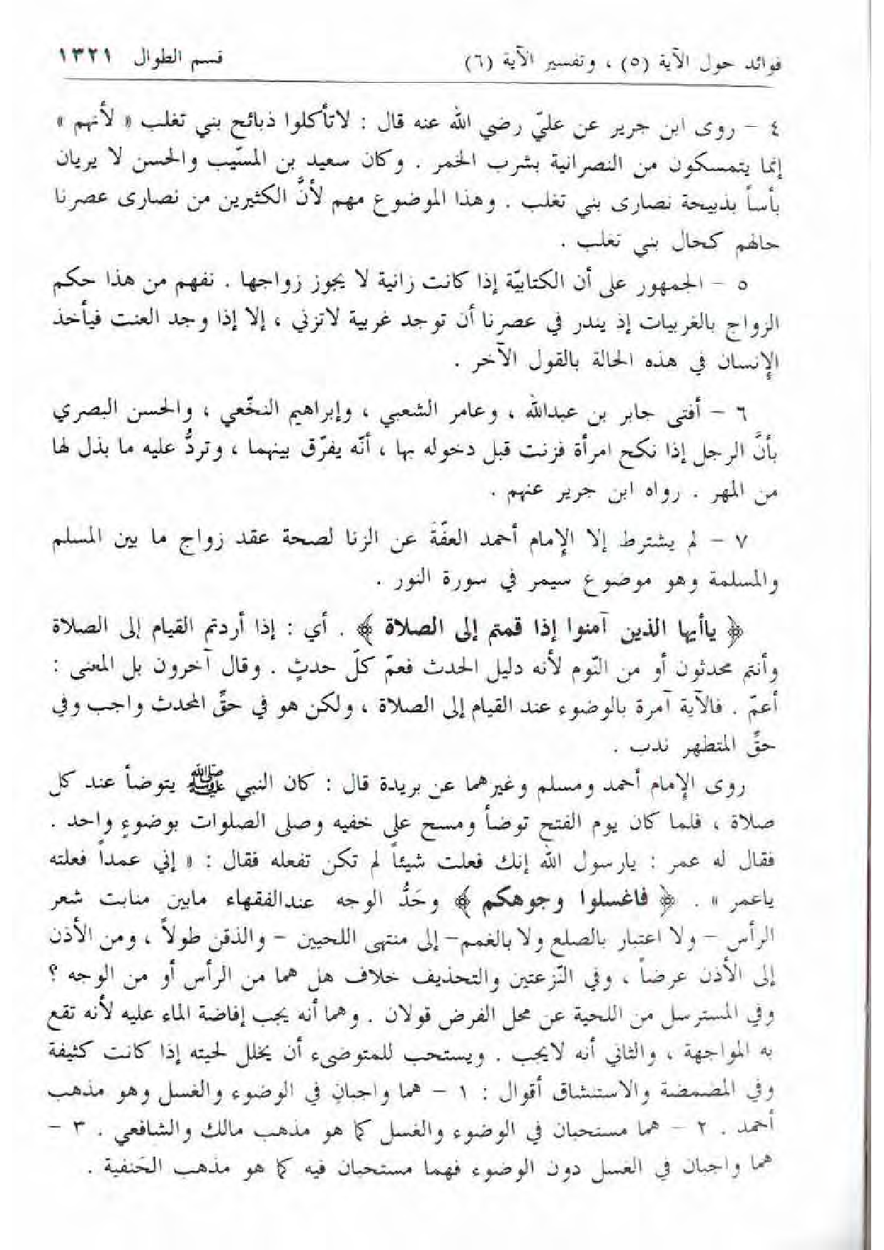 فقال له عمر: يا رسول الله إنك فعلت شيئا لم تكن تفعله فقال: «إني عمدا فعلته يا عمر». فَاغْسِلُوا وُجُوهَكُمْ وحدّ الوجه عند الفقهاء ما بين منابت شعر الرأس- ولا اعتبار بالصلع ولا بالغمم- إلى منتهى اللحيين- والذقن طولا، ومن الأذن إلى الأذن عرضا، وفي النّزعتين والتحذيف خلاف هل هما من الرأس أو من الوجه؟