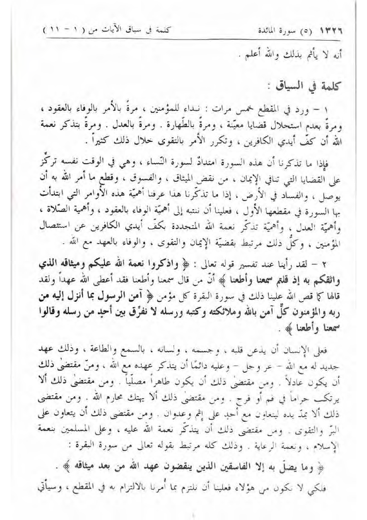 فإذا ما تذكرنا أن هذه السورة امتداد لسورة النّساء، وهي في الوقت نفسه تركّز على القضايا التي تنافي الإيمان، من نقض الميثاق، والفسوق، وقطع ما أمر الله به أن يوصل، والفساد في الأرض، إذا ما تذكّرنا هذا عرفنا أهميّة هذه الأوامر التي ابتدأت بها السورة في مقطعها الأول، فعلينا أن ننتبه إلى أهميّة الوفاء بالعقود، وأهمية الصّلاة، وأهميّة العدل، وأهميّة تذكّر نعمة الله المتجددة بكفّ أيدي الكافرين عن استئصال المؤمنين، وكلّ ذلك مرتبط بقضيّة الإيمان والتقوى، والوفاء بالعهد مع الله.