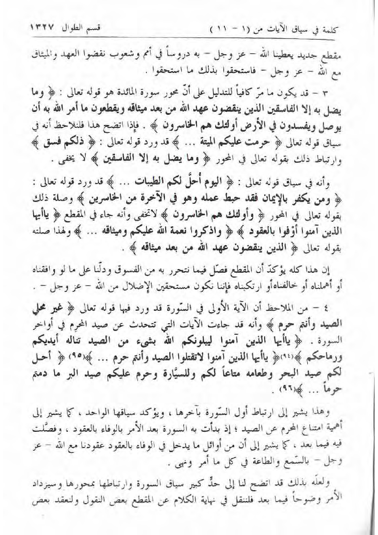 وهذا يشير إلى ارتباط أول السّورة بآخرها، ويؤكد سياقها الواحد، كما يشير إلى أهمية امتناع المحرم عن الصيد؛ إذ بدأت به السورة بعد الأمر بالوفاء بالعقود، وفصّلت فيه فيما بعد، كما يشير إلى أن من أوائل ما يدخل في الوفاء بالعقود عقودنا مع الله- عزّ وجل- بالسّمع والطاعة في كل ما أمر ونهى.