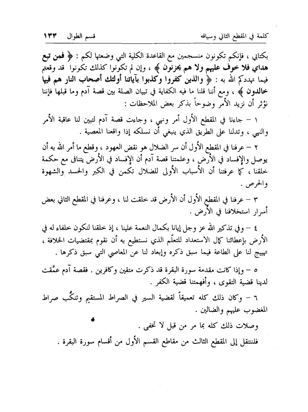 بكتابي، فإنكم تكونون منسجمين مع القاعدة الكلية التي وضعتها لكم: فَمَنْ تَبِعَ هُدايَ فَلا خَوْفٌ عَلَيْهِمْ وَلا هُمْ يَحْزَنُونَ، وإن لم تكونوا كذلك تكونوا قد وقعتم فيما تهددكم الله به: وَالَّذِينَ كَفَرُوا وَكَذَّبُوا بِآياتِنا أُولئِكَ أَصْحابُ النَّارِ هُمْ فِيها خالِدُونَ، ومع أننا قلنا ما فيه الكفاية في تبيان الصلة بين قصة آدم وما قبلها فإننا نؤثر أن نزيد الأمر وضوحا بذكر بعض الملاحظات: