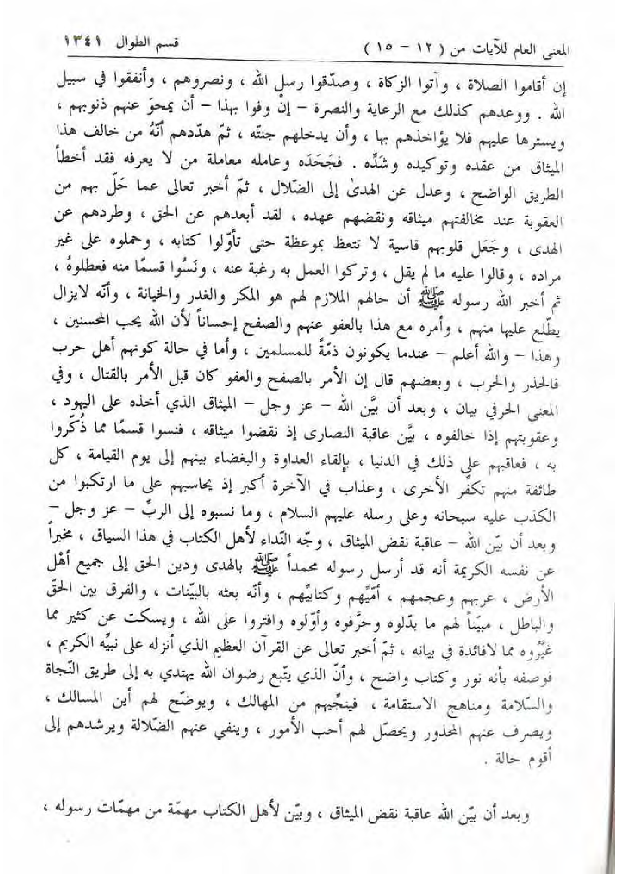 إن أقاموا الصلاة، وآتوا الزكاة، وصدّقوا رسل الله، ونصروهم، وأنفقوا في سبيل الله. ووعدهم كذلك مع الرعاية والنصرة- إن وفوا بهذا- أن يمحو عنهم ذنوبهم، ويسترها عليهم فلا يؤاخذهم بها، وأن يدخلهم جنّته، ثمّ هدّدهم أنّه من خالف هذا الميثاق من عقده وتوكيده وشدّه. فجحده وعامله معاملة من لا يعرفه فقد أخطأ الطريق الواضح، وعدل عن الهدى إلى الضّلال، ثمّ أخبر تعالى عما حلّ بهم من العقوبة عند مخالفتهم ميثاقه ونقضهم عهده، لقد أبعدهم عن الحق، وطردهم عن الهدى، وجعل قلوبهم قاسية لا تتعظ بموعظة حتى تأوّلوا كتابه، وحملوه على غير مراده، وقالوا عليه ما لم يقل، وتركوا العمل به رغبة عنه، ونسوا قسما منه فعطلوه، ثم أخبر الله رسوله صلّى الله عليه وسلّم أن حالهم الملازم لهم هو المكر والغدر والخيانة، وأنّه لا يزال يطّلع عليها منهم، وأمره مع هذا بالعفو عنهم والصفح إحسانا لأن الله يحب المحسنين، وهذا- والله أعلم- عند ما يكونون ذمّة للمسلمين، وأما في حالة كونهم أهل حرب فالحذر والحرب، وبعضهم قال إن الأمر بالصفح والعفو كان قبل الأمر بالقتال، وفي المعنى الحرفي بيان، وبعد أن بيّن الله- عزّ وجل- الميثاق الذي أخذه على اليهود، وعقوبتهم إذا خالفوه، بيّن عاقبة النصارى إذ نقضوا ميثاقه، فنسوا قسما مما ذكّروا به، فعاقبهم على ذلك في الدنيا، بإلقاء العداوة والبغضاء بينهم إلى يوم القيامة، كل طائفة منهم تكفّر الأخرى، وعذاب في الآخرة أكبر إذ يحاسبهم على ما