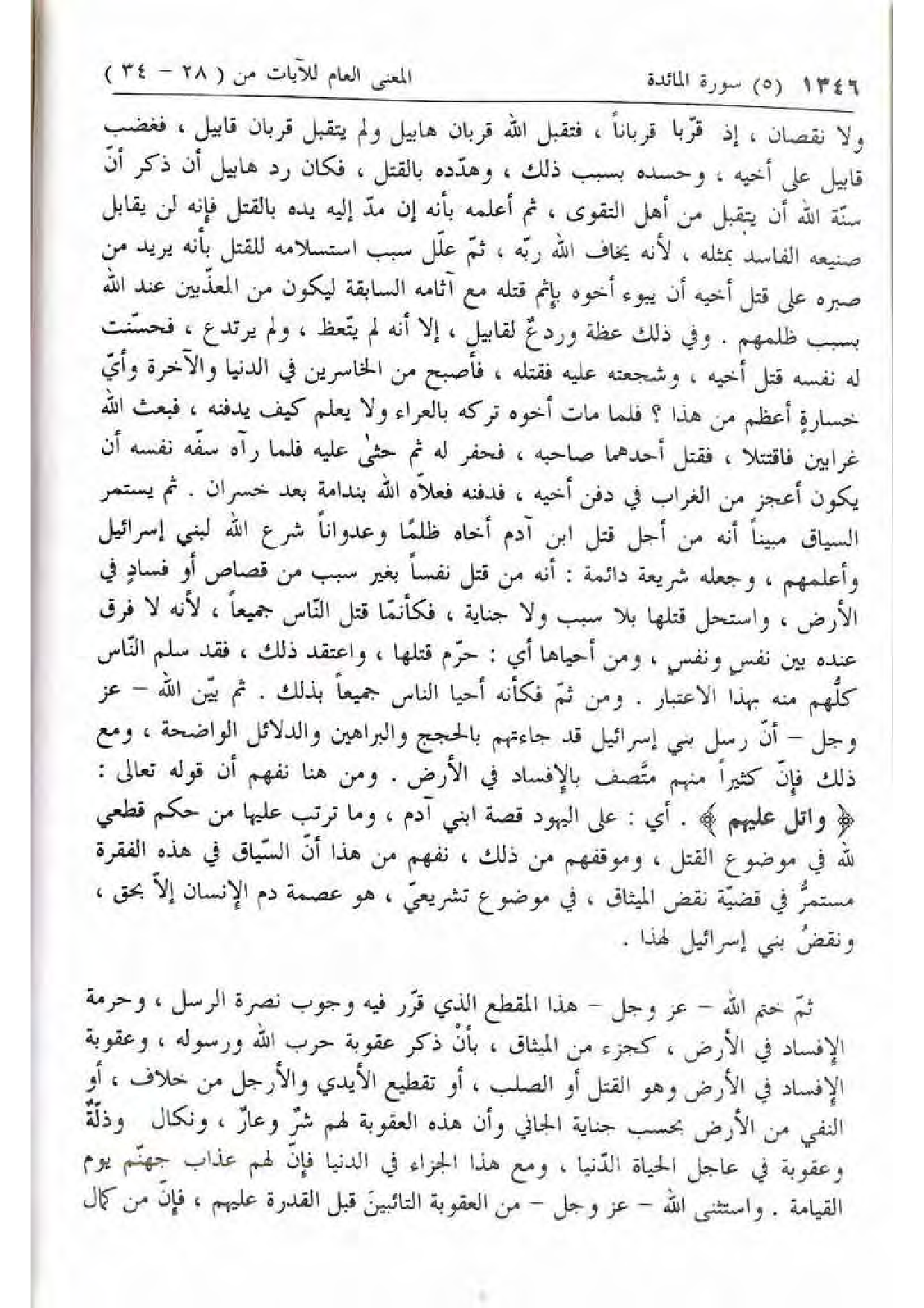ولا نقصان، إذ قرّبا قربانا، فتقبل الله قربان هابيل ولم يتقبل قربان قابيل، فغضب قابيل على أخيه، وحسده بسبب ذلك، وهدّده بالقتل، فكان رد هابيل أن ذكر أنّ سنّة الله أن يتقبل من أهل التقوى، ثم أعلمه بأنه إن مدّ إليه يده بالقتل فإنه لن يقابل صنيعه الفاسد بمثله، لأنه يخاف الله ربّه، ثمّ علّل سبب استسلامه للقتل بأنه يريد من صبره على قتل أخيه أن يبوء أخوه بإثم قتله مع آثامه السابقة ليكون من المعذّبين عند الله بسبب ظلمهم. وفي ذلك عظة وردع لقابيل، إلا أنه لم يتّعظ، ولم يرتدع، فحسّنت له نفسه قتل أخيه، وشجعته عليه فقتله، فأصبح من الخاسرين في الدنيا والآخرة وأيّ خسارة أعظم من هذا؟ فلما مات أخوه تركه بالعراء ولا يعلم كيف يدفنه، فبعث الله غرابين فاقتتلا، فقتل أحدهما صاحبه، فحفر له ثم حثى عليه فلما رآه سفّه نفسه أن يكون أعجز من الغراب في دفن أخيه، فدفنه فعلّاه الله بندامة بعد خسران. ثم يستمر السياق مبينا أنه من أجل قتل ابن آدم أخاه ظلما وعدوانا شرع الله لبني إسرائيل وأعلمهم، وجعله شريعة دائمة: أنه من قتل نفسا بغير سبب من قصاص أو فساد في الأرض، واستحل قتلها بلا سبب ولا جناية، فكأنمّا قتل النّاس جميعا، لأنه لا فرق عنده بين نفس ونفس، ومن أحياها أي: حرّم قتلها، واعتقد ذلك، فقد سلم النّاس كلّهم منه بهذا الاعتبار. ومن ثمّ فكأنه أحيا الناس جميعا بذلك. ثم بيّن الله- عزّ وجل- أنّ رسل بني إسرائيل قد جاءتهم بالحجج والبراهين والدلائل الواضحة، ومع ذلك فإنّ كثيرا منهم متّصف بالإفساد في الأرض. ومن هنا نفهم أن قوله تعالى:
