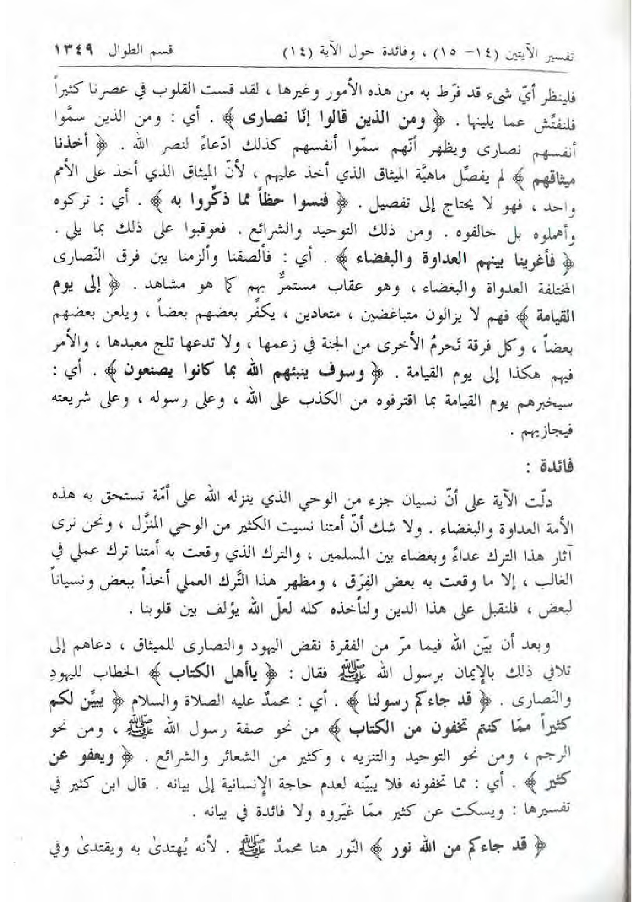 قَدْ جاءَكُمْ مِنَ اللَّهِ نُورٌ النّور هنا محمد صلّى الله عليه وسلّم. لأنه يهتدى به ويقتدى وفي