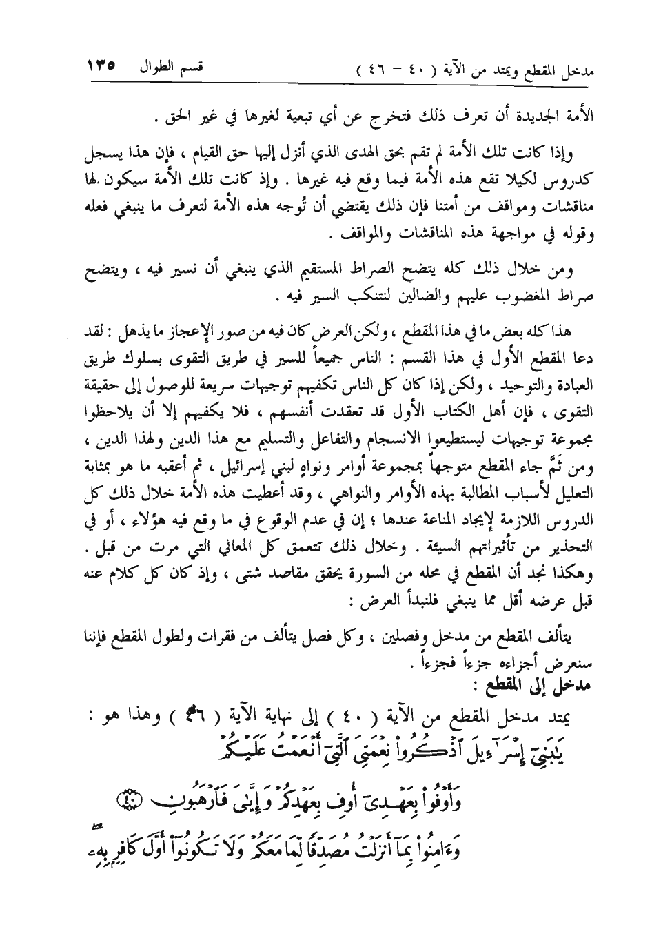 طريق العبادة والتوحيد، ولكن إذا كان كل الناس تكفيهم توجيهات سريعة للوصول إلى حقيقة التقوى، فإن أهل الكتاب الأول قد تعقدت أنفسهم، فلا يكفيهم إلا أن يلاحظوا مجموعة توجيهات ليستطيعوا الانسجام والتفاعل والتسليم مع هذا الدين ولهذا الدين، ومن ثم جاء المقطع متوجها بمجموعة أوامر ونواه لبني إسرائيل، ثم أعقبه ما هو بمثابة التعليل لأسباب المطالبة بهذه الأوامر والنواهي، وقد أعطيت هذه الأمة خلال ذلك كل الدروس اللازمة لإيجاد المناعة عندها؛ إن في عدم الوقوع في ما وقع فيه هؤلاء، أو في التحذير من تأثيراتهم السيئة. وخلال ذلك تتعمق كل المعاني التي مرت من قبل.