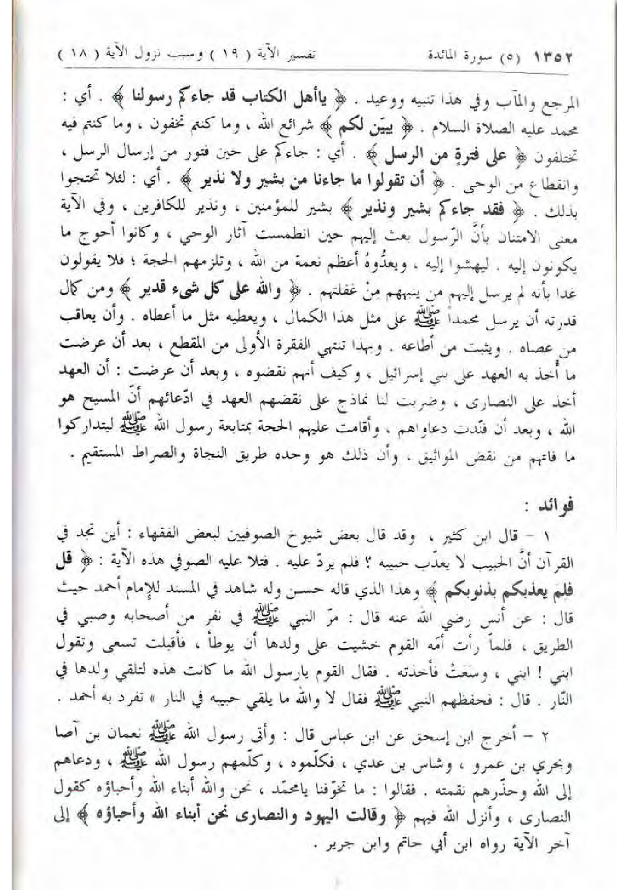2 - أخرج ابن إسحاق عن ابن عباس قال: وأتى رسول الله صلّى الله عليه وسلّم نعمان بن آصى وبحري بن عمرو، وشاس بن عدي، فكلّموه، وكلّمهم رسول الله صلّى الله عليه وسلّم، ودعاهم إلى الله وحذّرهم نقمته. فقالوا: ما تخوّفنا يا محمّد، نحن والله أبناء الله وأحباؤه كقول النصارى، وأنزل الله فيهم وَقالَتِ الْيَهُودُ وَالنَّصارى نَحْنُ أَبْناءُ اللَّهِ وَأَحِبَّاؤُهُ إلى آخر الآية رواه ابن أبي حاتم وابن جرير.