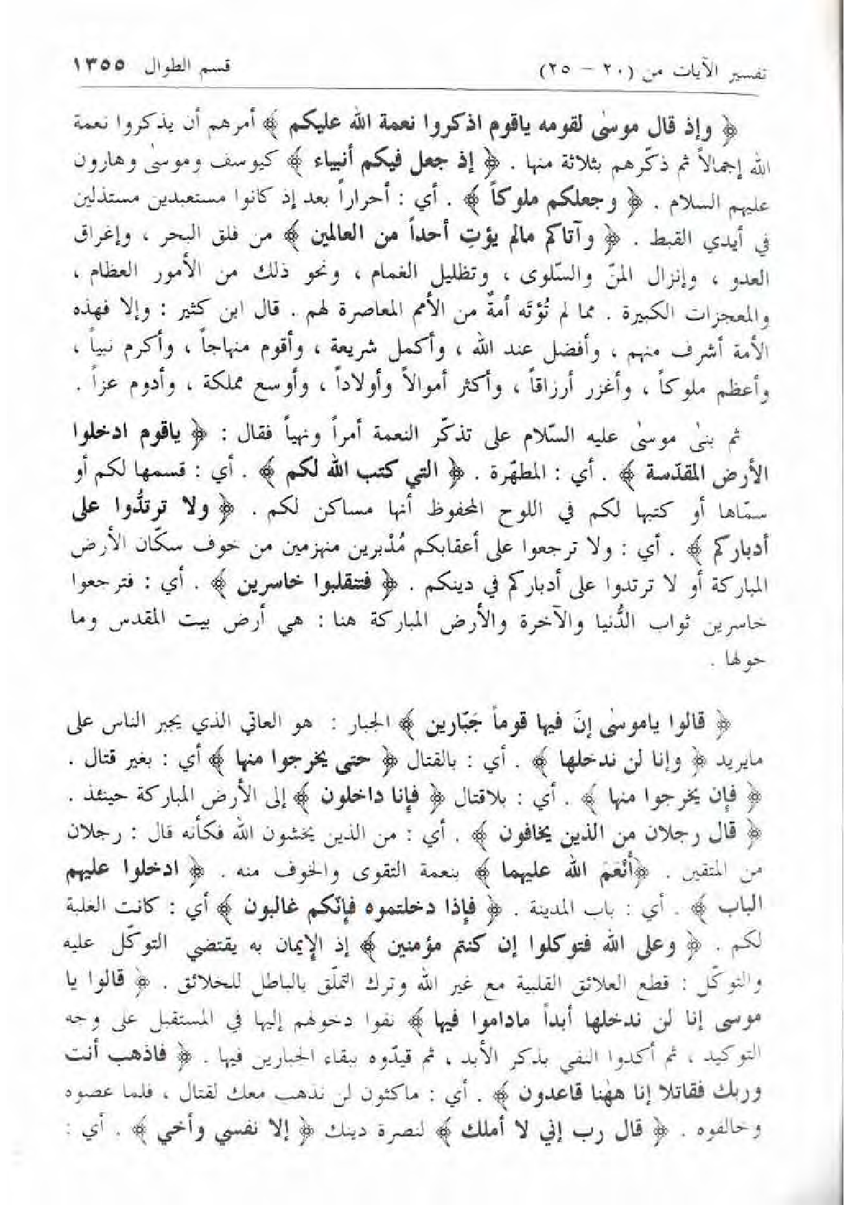 ثم بنى موسى عليه السّلام على تذكّر النعمة أمرا ونهيا فقال: يا قَوْمِ ادْخُلُوا الْأَرْضَ الْمُقَدَّسَةَ. أي: المطهّرة. الَّتِي كَتَبَ اللَّهُ لَكُمْ. أي: قسمها لكم أو سمّاها أو كتبها لكم في اللوح المحفوظ أنها مساكن لكم. وَلا تَرْتَدُّوا عَلى أَدْبارِكُمْ. أي: ولا ترجعوا على أعقابكم مدبرين منهزمين من خوف سكّان الأرض المباركة أو لا ترتدوا على أدباركم في دينكم. فَتَنْقَلِبُوا خاسِرِينَ. أي: فترجعوا خاسرين ثواب الدّنيا والآخرة والأرض المباركة هنا: هي أرض بيت المقدس وما حولها.