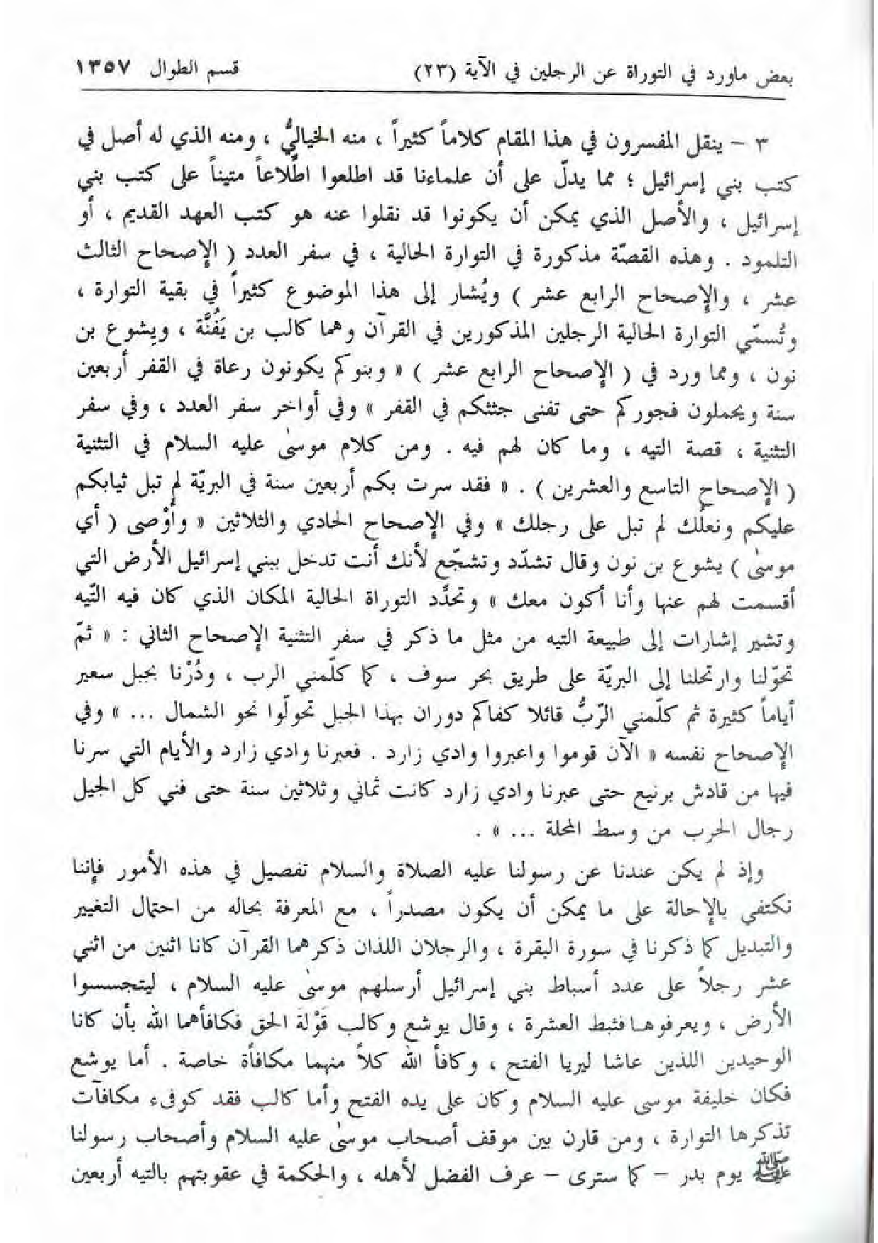 وإذا لم يكن عندنا عن رسولنا عليه الصلاة والسلام تفصيل في هذه الأمور فإننا نكتفي بالإحالة على ما يمكن أن يكون مصدرا، مع المعرفة بحاله من احتمال التغيير والتبديل كما ذكرنا في سورة البقرة، والرجلان اللذان ذكرهما القرآن كانا اثنين من اثني عشر رجلا على عدد أسباط بني إسرائيل أرسلهم موسى عليه السلام، ليتجسسوا الأرض، ويعرفوها فثبط العشرة، وقال يوشع وكالب قولة الحق فكافأهما الله بأن كانا الوحيدين اللذين عاشا ليريا الفتح، وكافأ الله كلا منهما مكافأة خاصة. أما يوشع فكان خليفة موسى عليه السلام وكان على يده الفتح وأما كالب فقد كوفئ مكافئات تذكرها التوراة، ومن قارن بين موقف أصحاب موسى عليه السلام