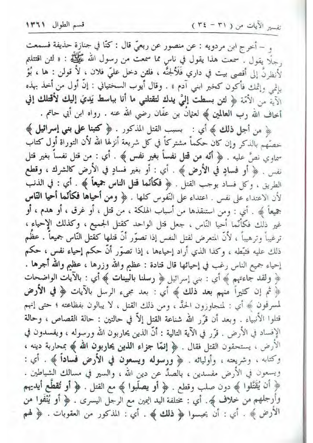 و- أخرج ابن مردويه: عن منصور عن ربعيّ قال: كنّا في جنازة حذيفة فسمعت رجلا يقول. سمعت هذا يقول في ناس مما سمعت من رسول الله صلّى الله عليه وسلّم: «لئن اقتتلتم لأنظرنّ إلى أقصى بيت في داري فلألجنّه، فلئن دخل عليّ فلان، لأقولن: ها، بؤ بإثمي وإثمك فأكون كخير ابني آدم». وقال أيوب السختياني: إنّ أول من أخذ بهذه الآية من الأمّة لَئِنْ بَسَطْتَ إِلَيَّ يَدَكَ لِتَقْتُلَنِي ما أَنَا بِباسِطٍ يَدِيَ إِلَيْكَ لِأَقْتُلَكَ إِنِّي أَخافُ اللَّهَ رَبَّ الْعالَمِينَ لعثمان بن عفّان رضي الله عنه. رواه ابن أبي حاتم.