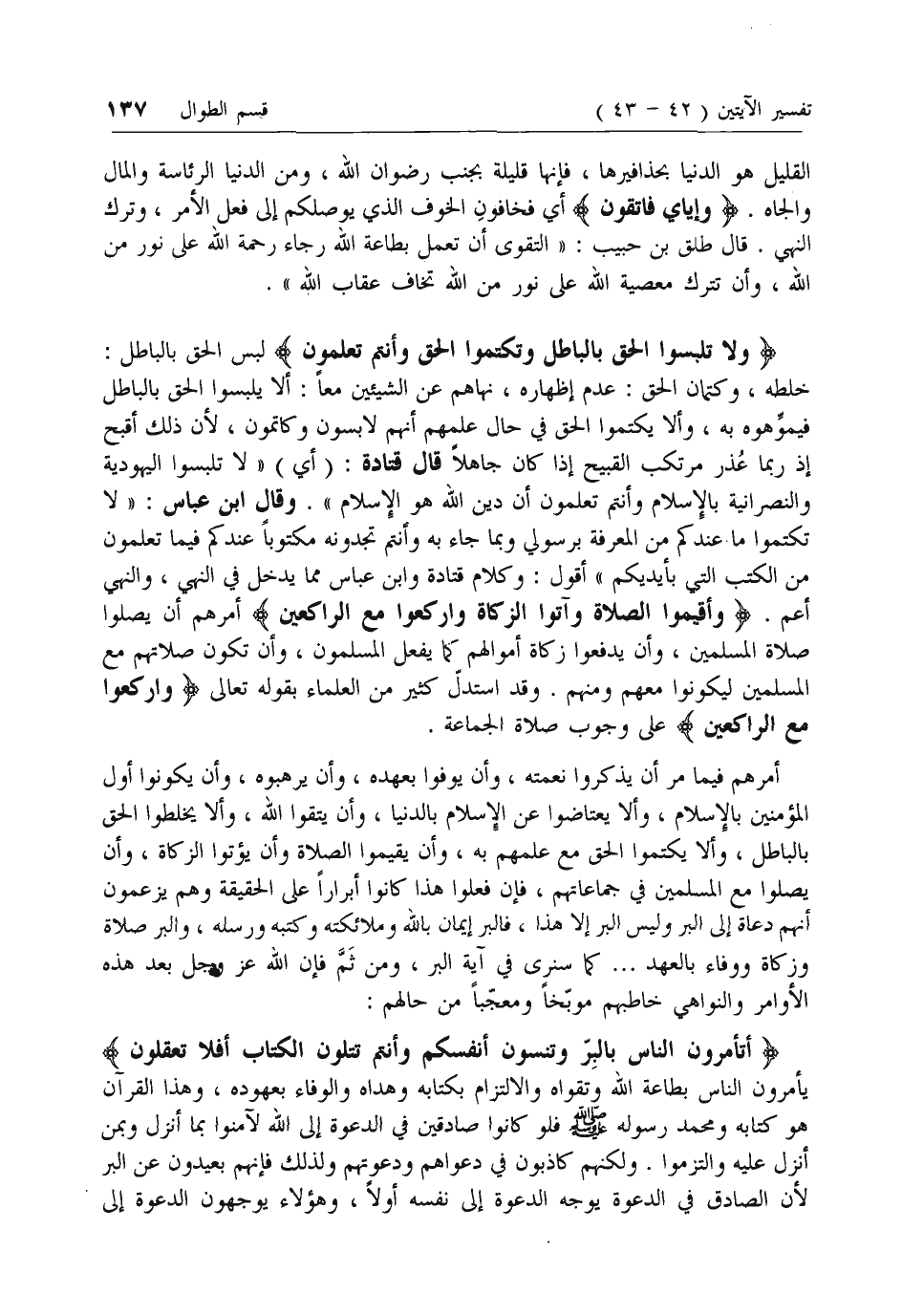 أَتَأْمُرُونَ النَّاسَ بِالْبِرِّ وَتَنْسَوْنَ أَنْفُسَكُمْ وَأَنْتُمْ تَتْلُونَ الْكِتابَ أَفَلا تَعْقِلُونَ يأمرون الناس بطاعة الله وتقواه والالتزام بكتابه وهداه والوفاء بعهوده، وهذا القرآن هو