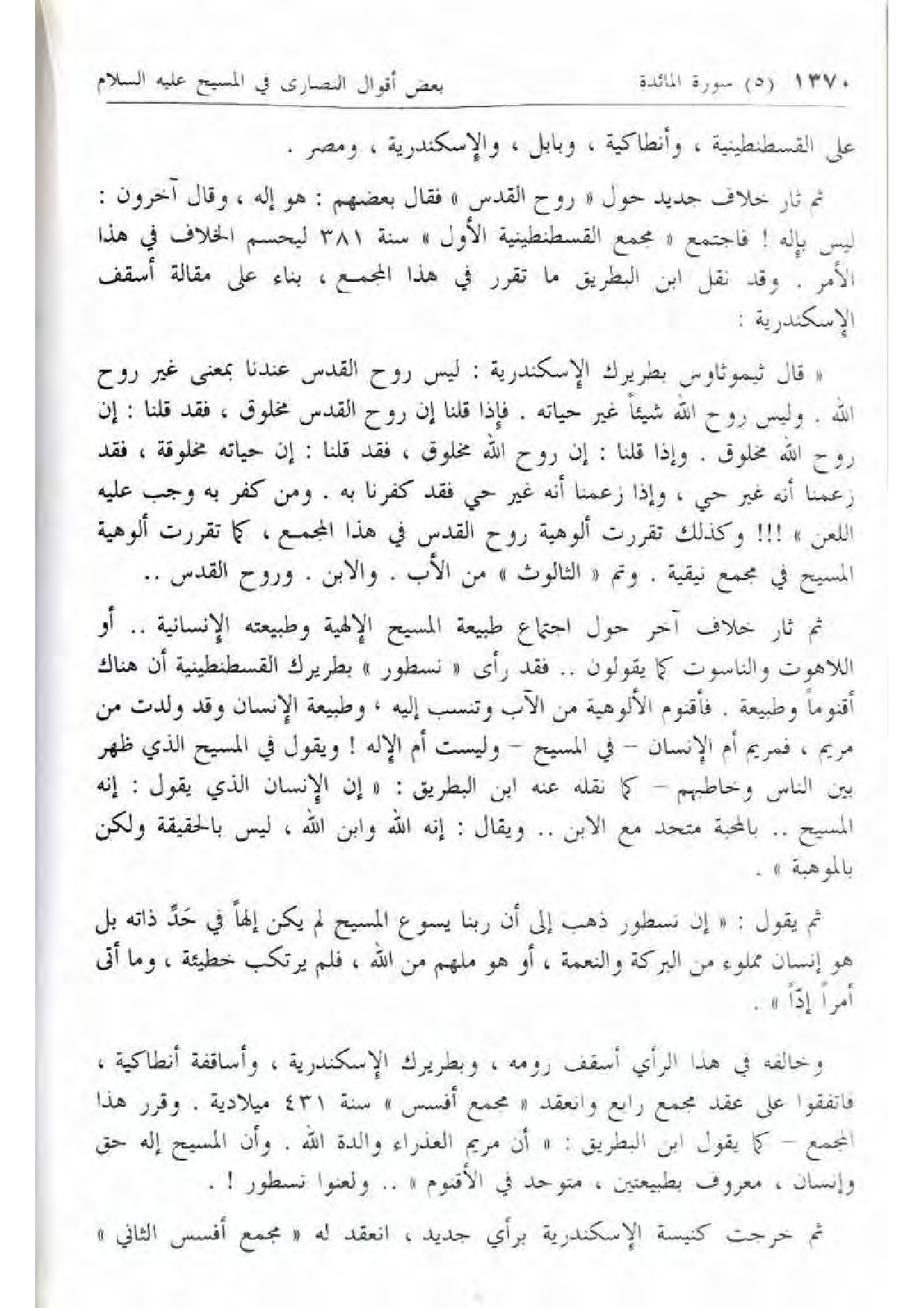 ليس بإله! فاجتمع «مجمع القسطنطينية الأول» سنة 381 ليحسم الخلاف في هذا الأمر. وقد نقل ابن البطريق ما تقرر في هذا المجمع، بناء على مقالة أسقف الإسكندرية:
