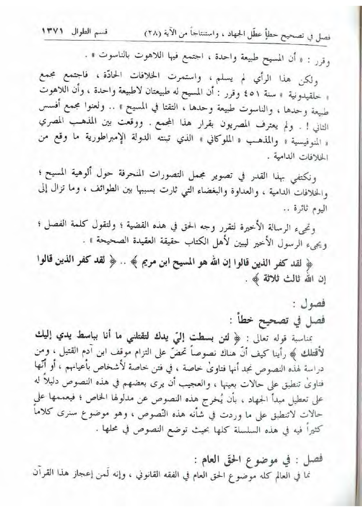 بمناسبة قوله تعالى: لَئِنْ بَسَطْتَ إِلَيَّ يَدَكَ لِتَقْتُلَنِي ما أَنَا بِباسِطٍ يَدِيَ إِلَيْكَ لِأَقْتُلَكَ رأينا كيف أنّ هناك نصوصا تحضّ على التزام موقف ابن آدم القتيل، ومن دراسة لهذه النصوص نجد أنها فتاوى خاصة، في فتن خاصة لأشخاص بأعيانهم، أو أنّها فتاوى تنطبق على حالات بعينها، والعجيب أن يرى بعضهم في هذه النصوص دليلا له على تعطيل مبدأ الجهاد، بأن يخرج هذه النصوص عن مدلولها الخاص؛ فيعممها على حالات لا تنطبق على ما وردت في شأنه هذه النّصوص، وهو موضوع سنرى كلاما كثيرا فيه في هذه السلسلة كلها بحيث توضع النصوص في محلها.