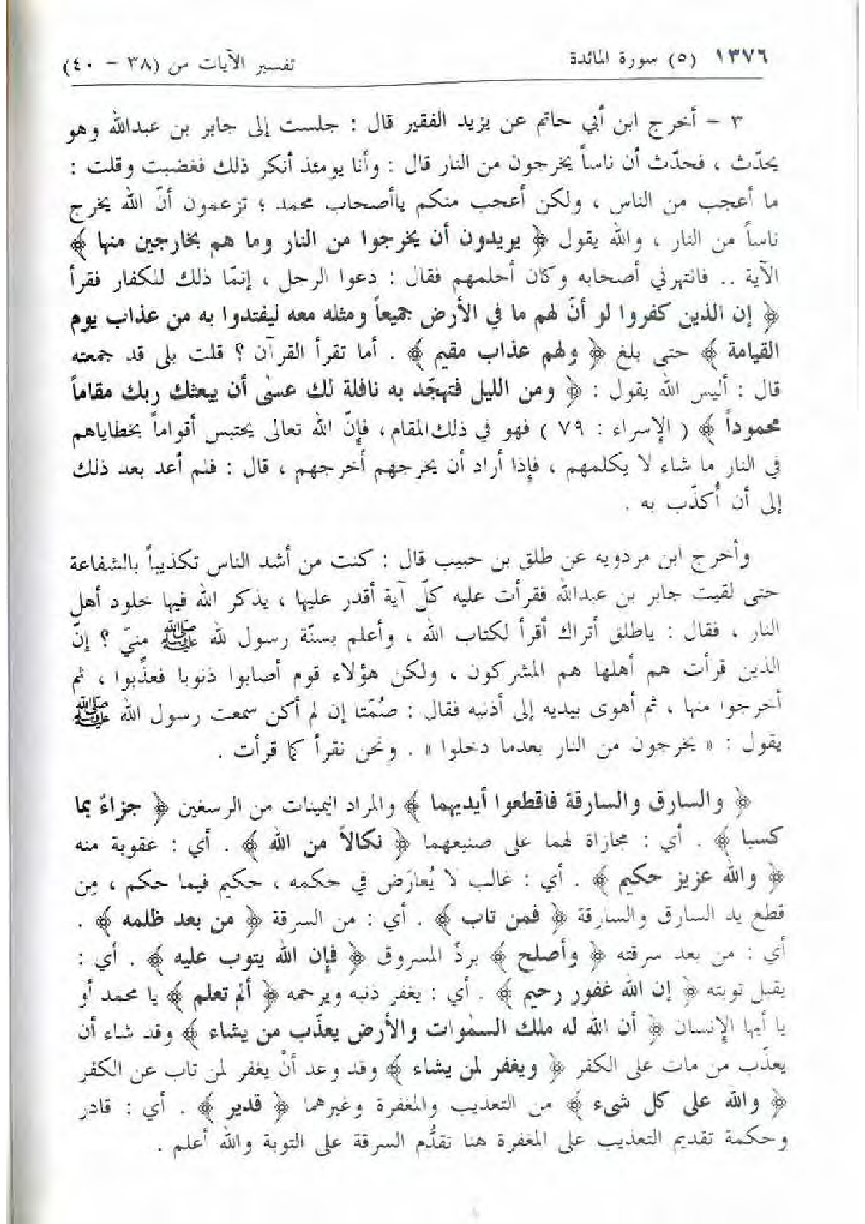3 - أخرج ابن أبي حاتم عن يزيد الفقير قال: جلست إلى جابر بن عبد الله وهو يحدّث، فحدّث أن ناسا يخرجون من النار قال: وأنا يومئذ أنكر ذلك فغضبت وقلت: