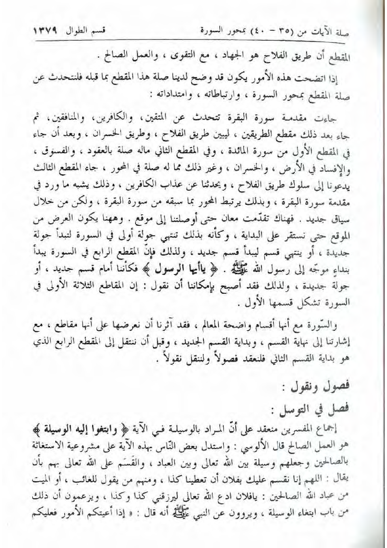 والسّورة مع أنها أقسام واضحة المعالم، فقد آثرنا أن نعرضها على أنها مقاطع، مع إشارتنا إلى نهاية القسم، وبداية القسم الجديد، وقبل أن ننتقل إلى المقطع الرابع الذي هو بداية القسم الثاني فلنعقد فصولا ولننقل نقولا.