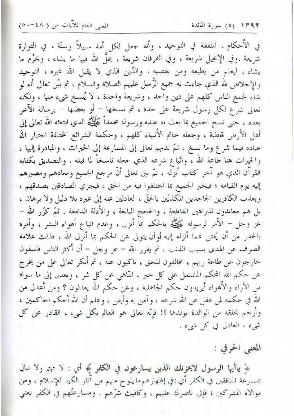 في الأحكام. المتفقة في التوحيد، وأنه جعل لكل أمة سبيلا وسنّة، في التوراة شريعة، وفي الإنجيل شريعة، وفي الفرقان شريعة، يحلّ الله فيها ما يشاء، ويحرّم ما يشاء، ليعلم من يطيعه ومن يعصيه، والدّين الذي لا يقبل الله غيره، التوحيد والإخلاص لله الذي جاءت به جميع الرّسل عليهم الصلاة والسلام، ثم بيّن تعالى أنه لو شاء لجمع الناس كلهم على دين واحد، وشريعة واحدة، لا ينسخ شئ منها، ولكنه تعالى شرع لكل رسول شريعة على حدة، ثم نسخها- أو بعضها- برسالة الآخر بعده، حتى نسخ