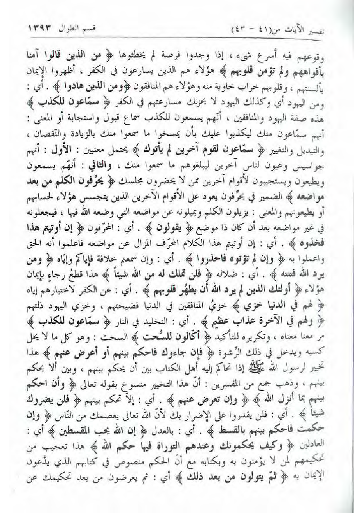 أنهم سمّاعون منك ليكذبوا عليك بأن يمسخوا ما سمعوا منك بالزيادة والنّقصان، والتبديل والتغيير سَمَّاعُونَ لِقَوْمٍ آخَرِينَ لَمْ يَأْتُوكَ يحتمل معنيين: الأول: أنهم جواسيس وعيون لناس آخرين ليبلغوهم ما سمعوا منك، والثاني: أنهّم يسمعون ويطيعون ويستجيبون لأقوام آخرين ممن لا يحضرون مجلسك يُحَرِّفُونَ الْكَلِمَ مِنْ بَعْدِ مَواضِعِهِ الضمير في يحرّفون يعود على الأقوام الآخرين الذين يتجسس هؤلاء لحسابهم أو يطيعونهم والمعنى: يزيلون الكلم ويميلونه عن مواضعه التي وضعه الله فيها، فيجعلونه في غير مواضعه بعد أن كان ذا موضع يَقُولُونَ. أي: المحرّفون إِنْ أُوتِيتُمْ هذا فَخُذُوهُ. أي: إن أوتيتم هذا الكلام المحرّف المزال عن مواضعه فاعلموا أنه الحق واعملوا به وَإِنْ لَمْ تُؤْتَوْهُ فَاحْذَرُوا. أي: وإن سمعتم خلافة فإياكم وإيّاه وَمَنْ يُرِدِ اللَّهُ فِتْنَتَهُ. أي: ضلاله فَلَنْ تَمْلِكَ لَهُ مِنَ اللَّهِ شَيْئاً هذا قطع رجاء بإيمان هؤلاء أُولئِكَ الَّذِينَ لَمْ يُرِدِ اللَّهُ أَنْ يُطَهِّرَ قُلُوبَهُمْ. أي: عن الكفر لاختيارهم إياه لَهُمْ فِي الدُّنْيا خِزْيٌ خزي المنافقين في الدنيا فضيحتهم، وخزي اليهود ذلتهم وَلَهُمْ فِي الْآخِرَةِ عَذابٌ عَظِيمٌ. أي: التخليد في النار