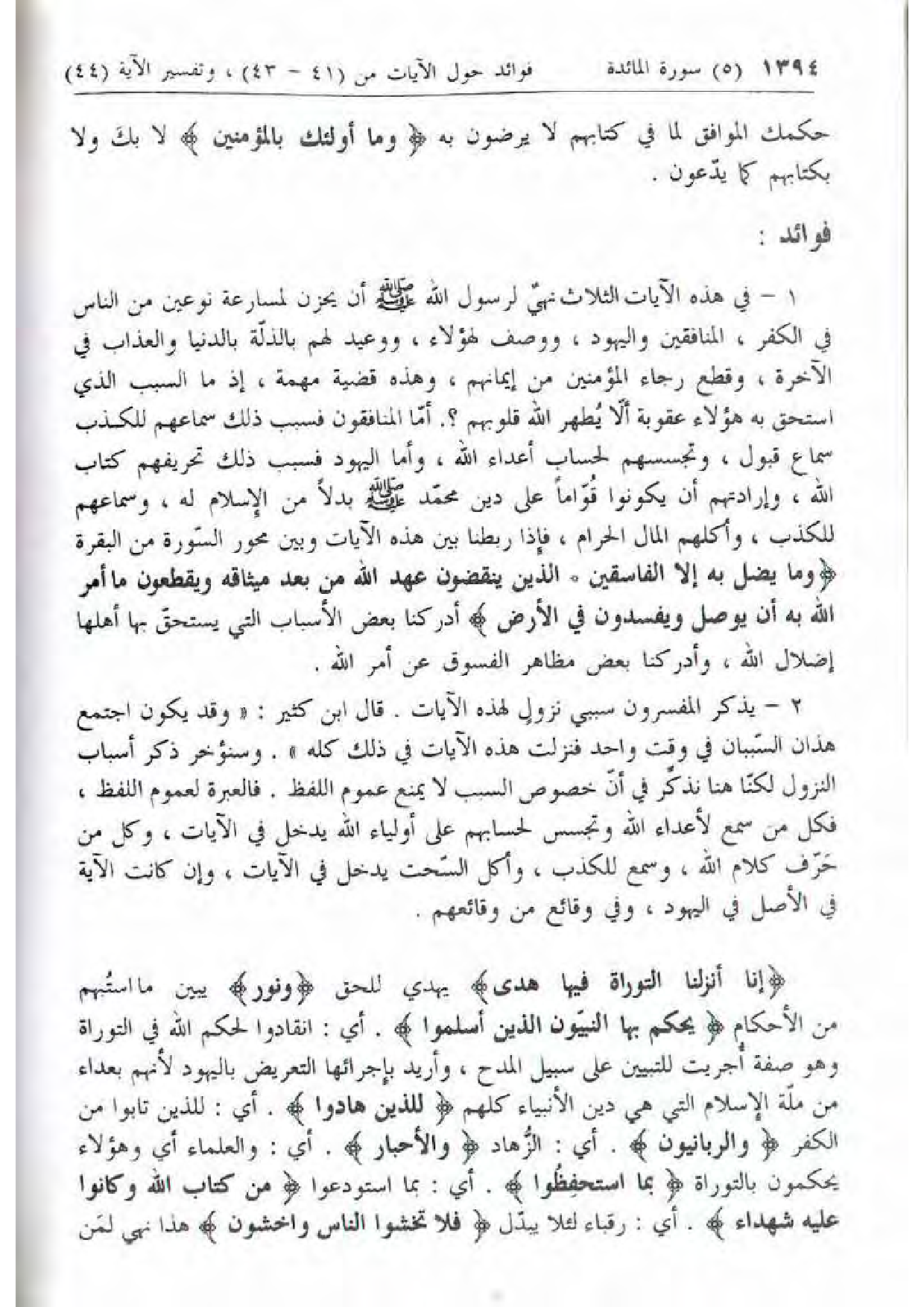 إِنَّا أَنْزَلْنَا التَّوْراةَ فِيها هُدىً يهدي للحق وَنُورٌ يبين ما استبهم من الأحكام يَحْكُمُ بِهَا النَّبِيُّونَ الَّذِينَ أَسْلَمُوا. أي: انقادوا لحكم الله في التوراة وهو صفة أجريت للتبيين على سبيل المدح، وأريد بإجرائها التعريض باليهود لأنهم بعداء من ملّة الإسلام التي هي دين الأنبياء كلهم لِلَّذِينَ هادُوا. أي: للذين تابوا من الكفر وَالرَّبَّانِيُّونَ. أي: الزّهاد وَالْأَحْبارُ. أي: والعلماء أي وهؤلاء يحكمون بالتوراة بِمَا اسْتُحْفِظُوا. أي: بما استودعوا مِنْ كِتابِ اللَّهِ وَكانُوا عَلَيْهِ شُهَداءَ. أي: رقباء لئلا يبدّل فَلا تَخْشَوُا النَّاسَ وَاخْشَوْنِ هذا نهي لمن