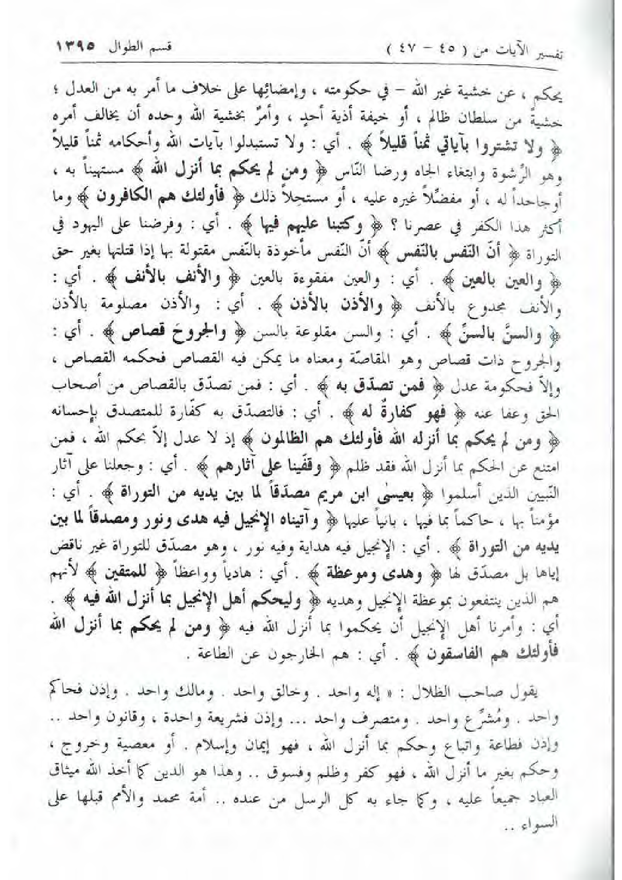 والجروح ذات قصاص وهو المقاصّة ومعناه ما يمكن فيه القصاص فحكمه القصاص، وإلّا فحكومة عدل فَمَنْ تَصَدَّقَ بِهِ. أي: فمن تصدّق بالقصاص من أصحاب الحق وعفا عنه فَهُوَ كَفَّارَةٌ لَهُ. أي: فالتصدّق به كفّارة للمتصدق بإحسانه وَمَنْ لَمْ يَحْكُمْ بِما أَنْزَلَ اللَّهُ فَأُولئِكَ هُمُ الظَّالِمُونَ إذ لا عدل إلّا بحكم الله، فمن امتنع عن الحكم بما أنزل الله فقد ظلم
