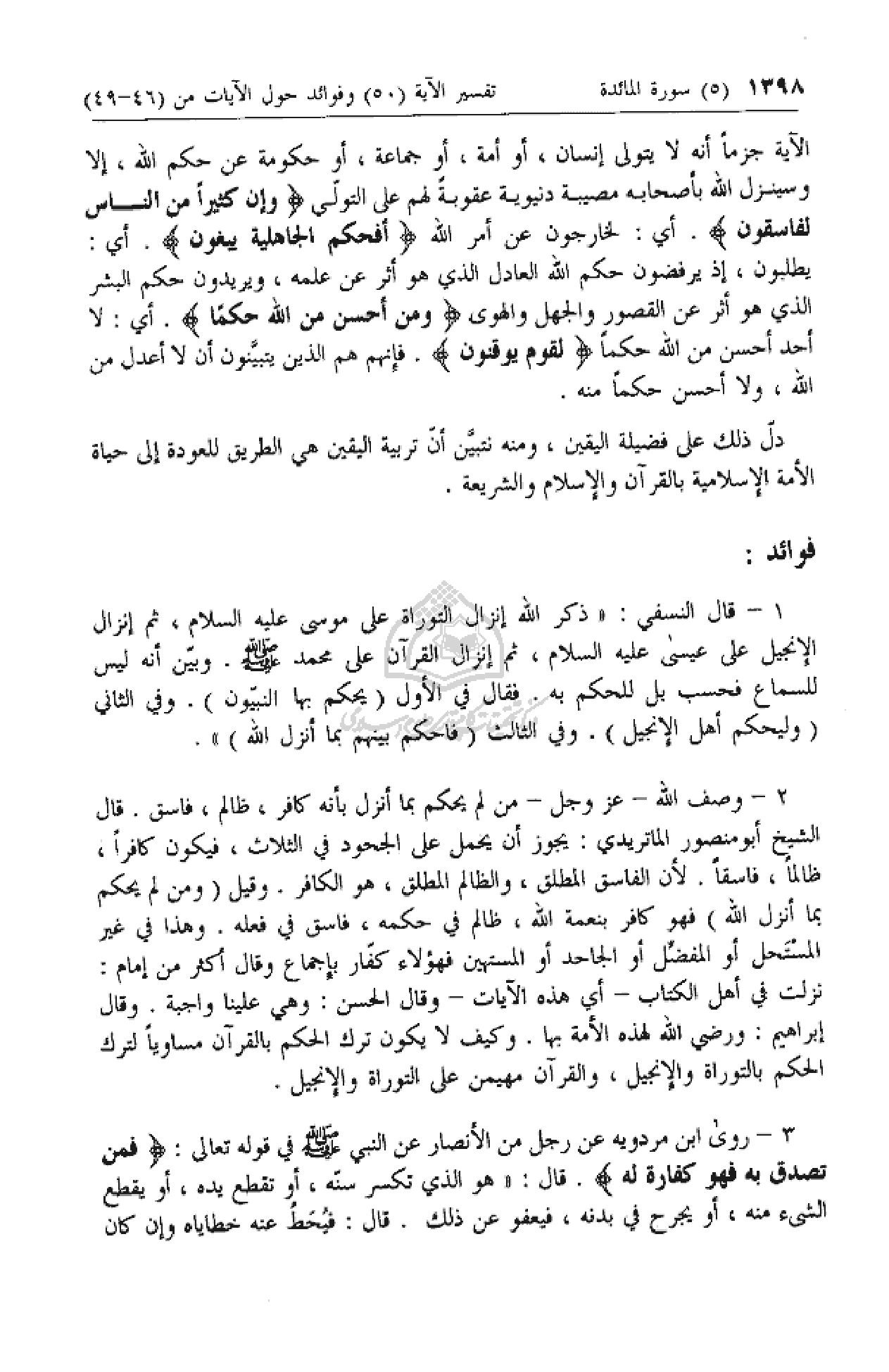 قال النسفي: «ذكر الله إنزال التوراة على موسى عليه السلام، ثم إنزال الإنجيل على عيسى عليه السلام، ثم إنزال القرآن على محمد صلّى الله عليه وسلّم. وبيّن أنه ليس للسماع فحسب بل للحكم به. فقال في الأول (يَحْكُمُ بِهَا النَّبِيُّونَ). وفي الثاني (وَلْيَحْكُمْ أَهْلُ الْإِنْجِيلِ). وفي الثالث (فَاحْكُمْ بَيْنَهُمْ بِما أَنْزَلَ اللَّهُ)».