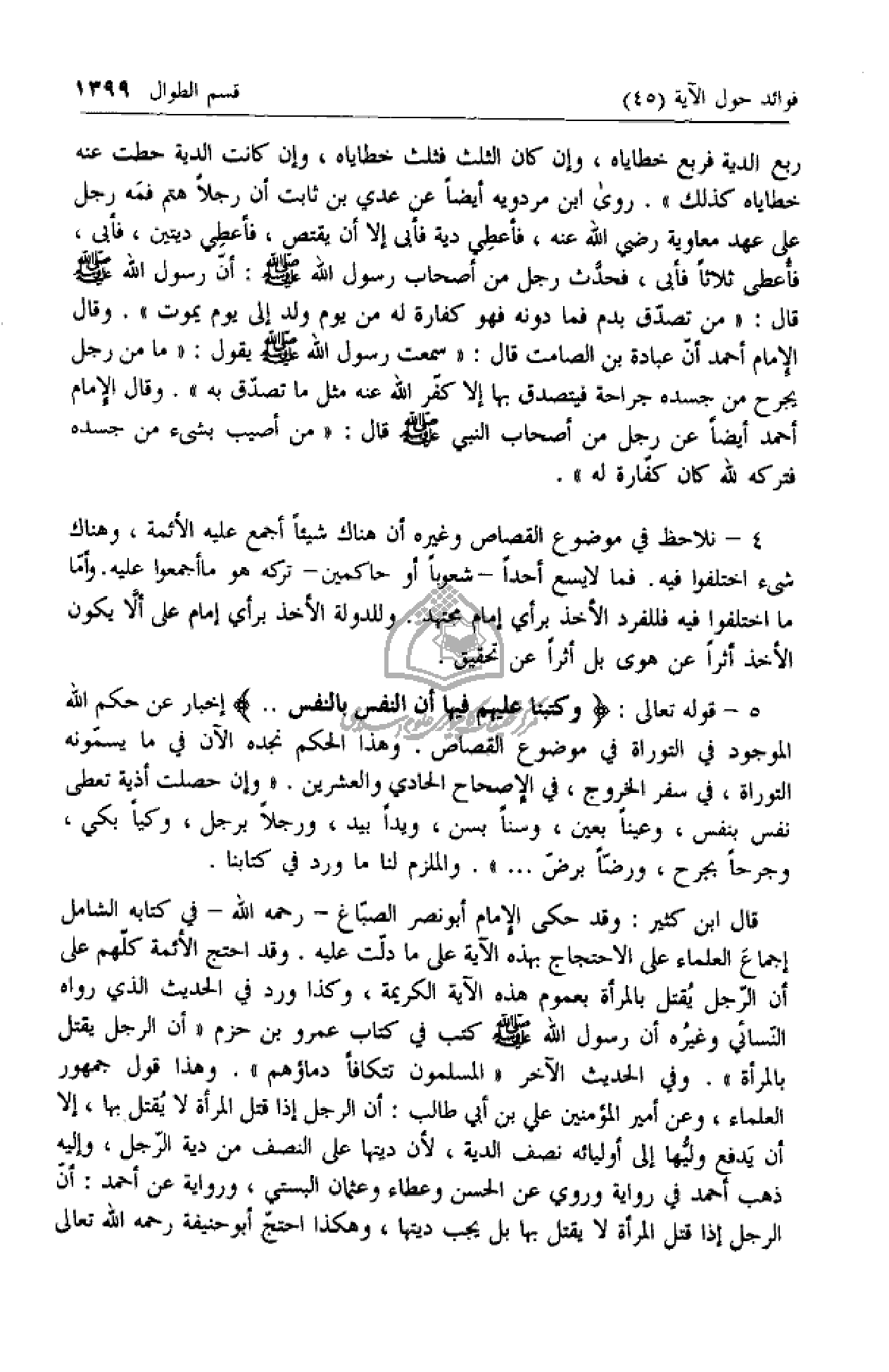 قال ابن كثير: وقد حكى الإمام أبو نصر الصبّاغ- رحمه الله- في كتابه الشامل إجماع العلماء على الاحتجاج بهذه الآية على ما دلّت عليه. وقد احتج الأئمة كلّهم على أن الرّجل يقتل بالمرأة بعموم هذه الآية الكريمة، وكذا ورد في الحديث الذي رواه النّسائي وغيره أن رسول الله صلّى الله عليه وسلّم كتب في كتاب عمرو بن حزم «أن الرجل يقتل بالمرأة». وفي الحديث الآخر «المسلمون تتكافأ دماؤهم». وهذا قول جمهور العلماء، وعن أمير المؤمنين علي بن أبي طالب: أن الرجل إذا قتل المرأة لا يقتل بها، إلا أن يدفع وليّها إلى أوليائه نصف الدية، لأن ديتها على النصف من دية الرّجل، وإليه ذهب أحمد في رواية وروي عن الحسن وعطاء وعثمان البستي، ورواية عن أحمد: أنّ الرجل إذا قتل المرأة لا يقتل بها بل يجب ديتها، وهكذا احتجّ أبو حنيفة رحمه الله تعالى