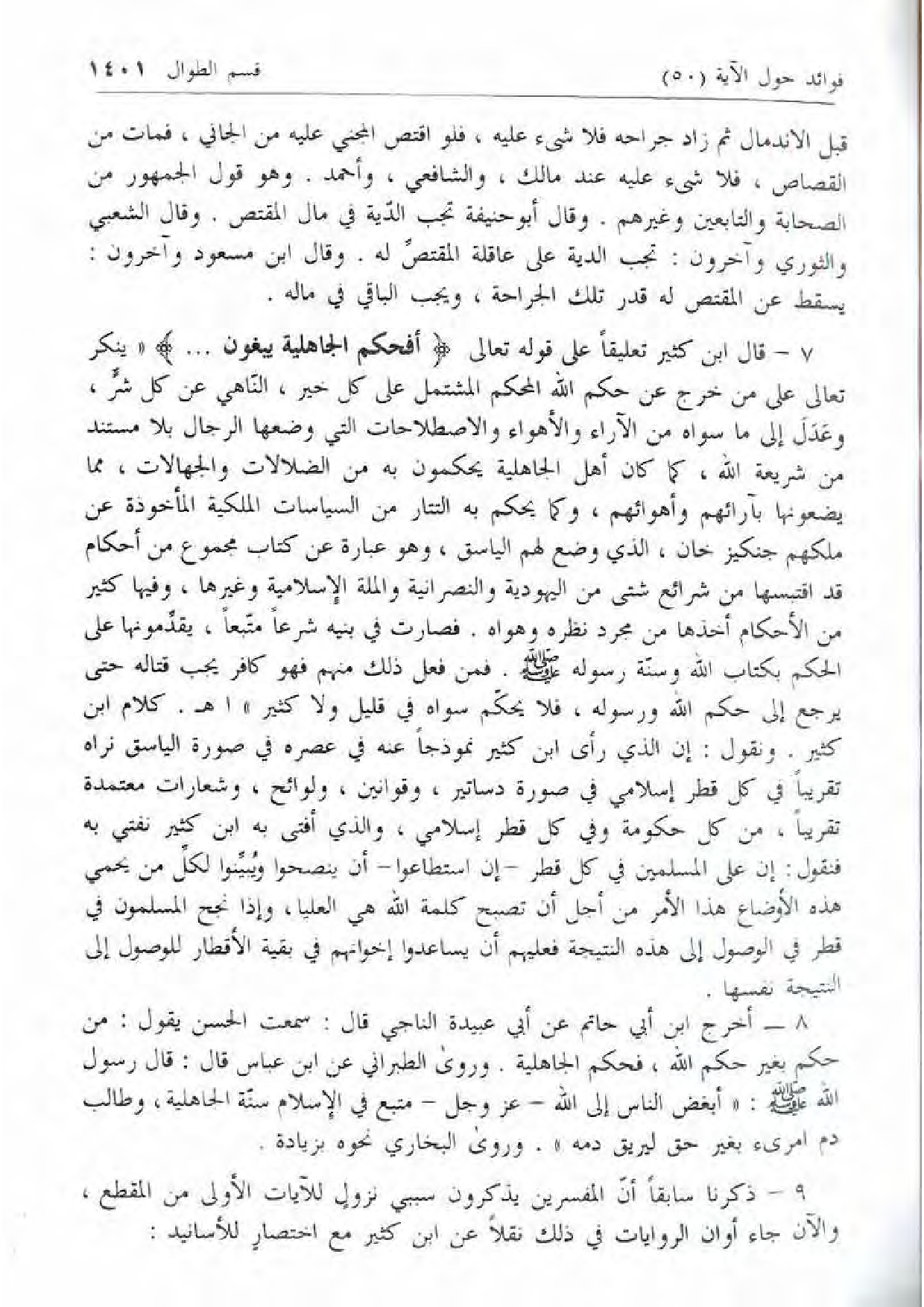 7 - قال ابن كثير تعليقا على قوله تعالى أَفَحُكْمَ الْجاهِلِيَّةِ يَبْغُونَ ... «ينكر تعالى على من خرج عن حكم الله المحكم المشتمل على كل خير، النّاهي عن كل شرّ، وعدل إلى ما سواه من الآراء والأهواء والاصطلاحات التي وضعها الرجال بلا مستند من شريعة الله، كما كان أهل الجاهلية يحكمون به من الضلالات والجهالات، مما يضعونها بآرائهم وأهوائهم، وكما يحكم به التتار من السياسات الملكية المأخوذة عن ملكهم جنكيز خان، الذي وضع لهم الياسق، وهو عبارة عن كتاب مجموع من أحكام قد اقتبسها من شرائع شتى من اليهودية والنصرانية والملة الإسلامية وغيرها، وفيها كثير من الأحكام أخذها من مجرد نظره وهواه. فصارت في بنيه شرعا متّبعا، يقدّمونها على الحكم بكتاب الله وسنّة رسوله صلّى الله عليه وسلّم. فمن فعل ذلك منهم فهو كافر يجب قتاله حتى يرجع إلى حكم الله ورسوله، فلا يحكّم سواه في قليل ولا كثير» اه. كلام ابن كثير. ونقول: إن الذي رأى ابن كثير نموذجا عنه في عصره في صورة الياسق نراه تقريبا في كل قطر إسلامي في صورة دساتير، وقوانين، ولوائح، وشعارات معتمدة تقريبا، من كل حكومة وفي كل قطر إسلامي، والذي أفتى به ابن كثير نفتي به فنقول: إن على المسلمين في كل قطر- إن استطاعوا- أن ينصحوا ويبيّنوا لكلّ من يحمي هذه الأوضاع هذا الأمر من أجل أن تصبح كلمة الله هي العليا، وإذا نجح المسلمون في قطر في الوصول إلى هذه النتيجة فعليهم أن يساعدوا إخوانهم في بقية الأقطار للوصول إلى النتيجة نفسها.