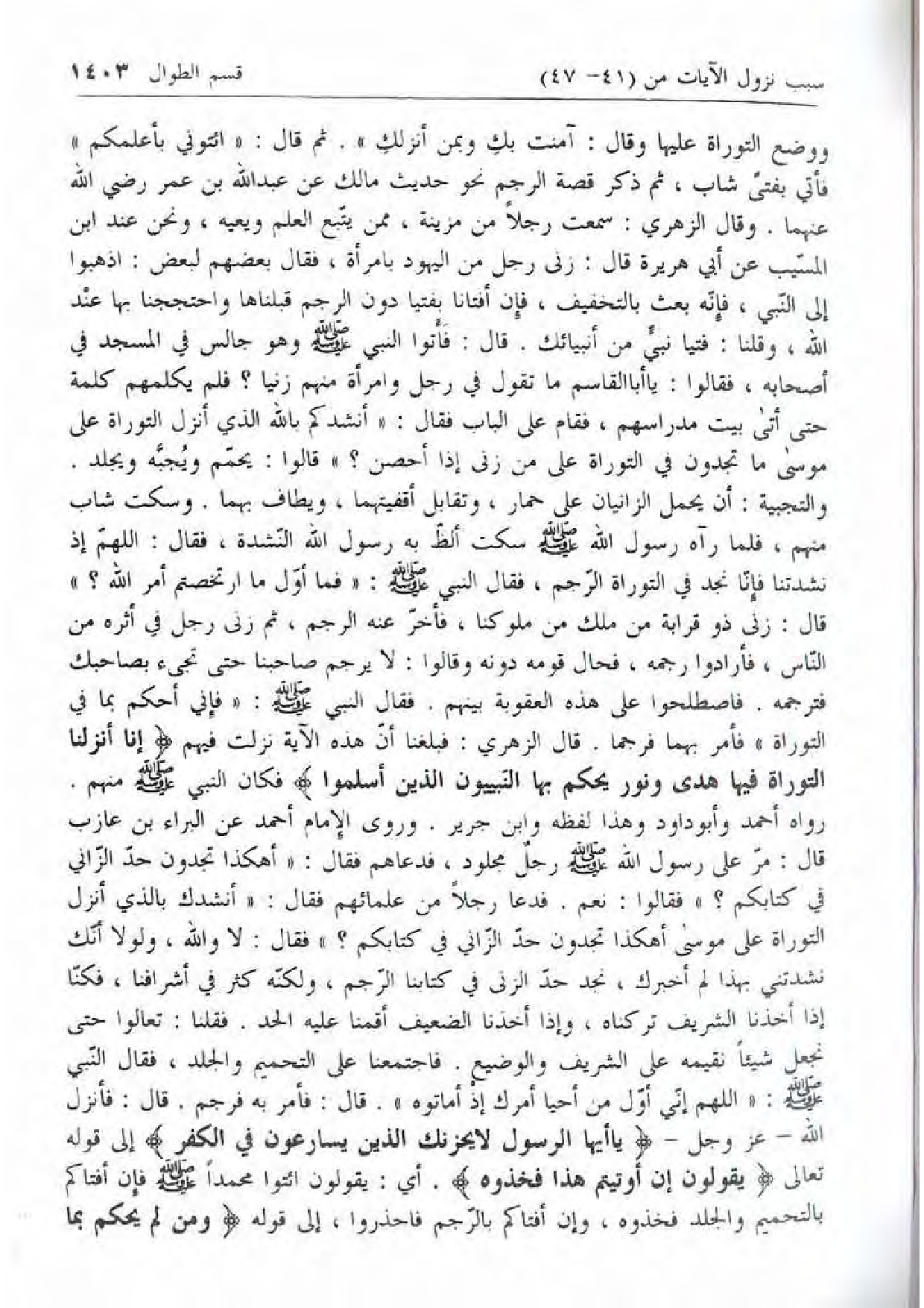 ثم زنى رجل في أثره من النّاس، فأرادوا رجمه، فحال قومه دونه وقالوا: لا يرجم صاحبنا حتى تجئ بصاحبك فترجمه. فاصطلحوا على هذه العقوبة بينهم. فقال النبي صلّى الله عليه وسلّم: «فإني أحكم بما في التوراة» فأمر بهما فرجما. قال الزهري: فبلغنا أنّ هذه الآية نزلت فيهم إِنَّا أَنْزَلْنَا التَّوْراةَ فِيها هُدىً وَنُورٌ يَحْكُمُ بِهَا النَّبِيُّونَ الَّذِينَ أَسْلَمُوا فكان النبي صلّى الله عليه وسلّم منهم.