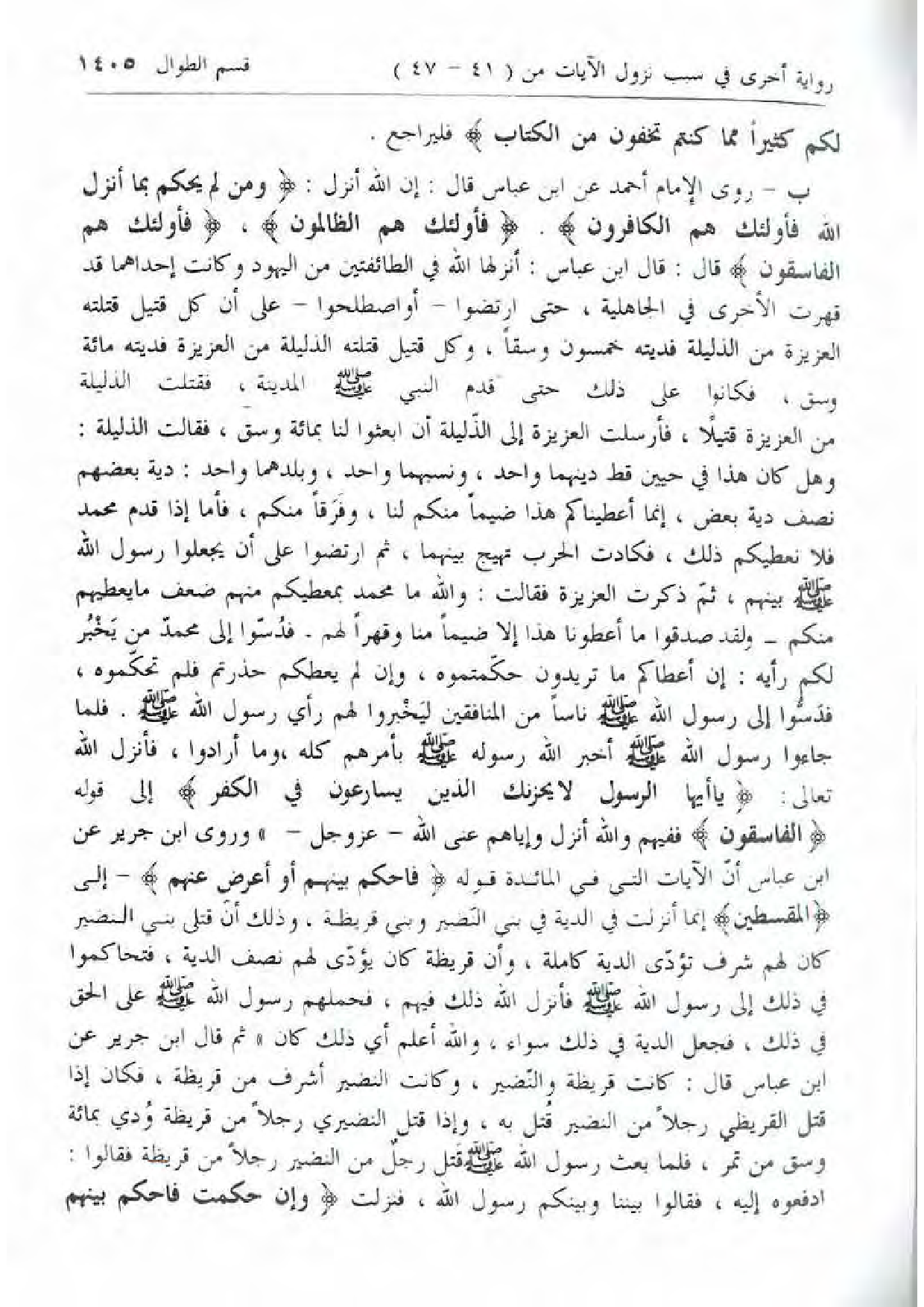 ب- روى الإمام أحمد عن ابن عباس قال: إن الله أنزل: وَمَنْ لَمْ يَحْكُمْ بِما أَنْزَلَ اللَّهُ فَأُولئِكَ هُمُ الْكافِرُونَ. فَأُولئِكَ هُمُ الظَّالِمُونَ، فَأُولئِكَ هُمُ الْفاسِقُونَ قال: قال ابن عباس: أنزلها الله في الطائفتين من اليهود وكانت إحداهما قد قهرت الأخرى في الجاهلية، حتى ارتضوا- أو اصطلحوا- على أن كل قتيل قتلته العزيزة من الذليلة فديته خمسون وسقا، وكل قتيل قتلته الذليلة من العزيزة فديته مائة وسق، فكانوا على ذلك حتى قدم النبي صلّى الله عليه وسلّم المدينة، فقتلت الذليلة من العزيزة قتيلا، فأرسلت العزيزة إلى الذّليلة أن ابعثوا لنا بمائة وسق، فقالت الذليلة: