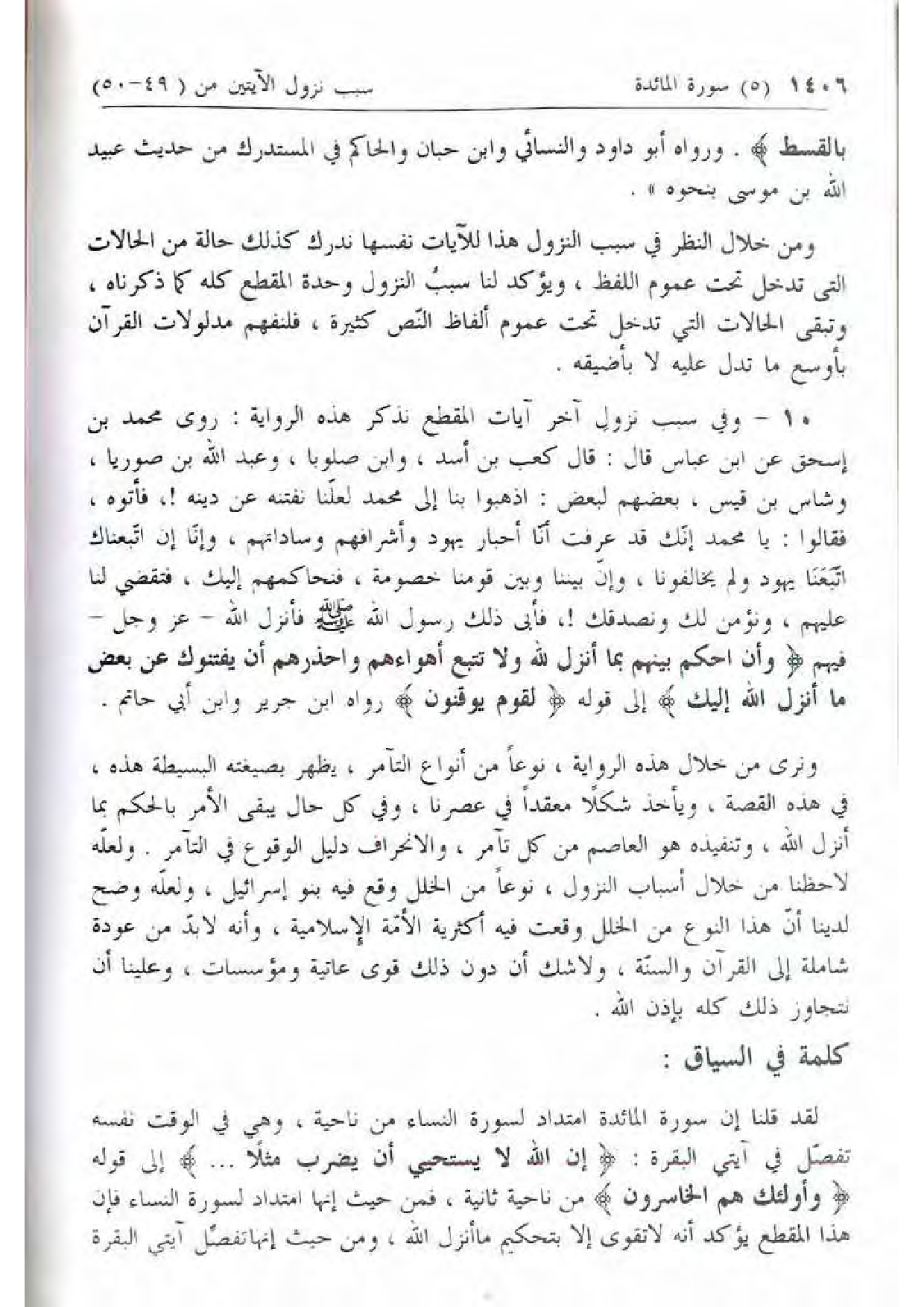 10 - وفي سبب نزول آخر آيات المقطع نذكر هذه الرواية: روى محمد بن إسحاق عن ابن عباس قال: قال كعب بن أسد، وابن صلوبا، وعبد الله بن صوريا، وشاس بن قيس، بعضهم لبعض: اذهبوا بنا إلى محمد لعلّنا نفتنه عن دينه!، فأتوه، فقالوا: يا محمد إنّك قد عرفت أنّا أحبار يهود وأشرافهم وساداتهم، وإنّا إن اتّبعناك اتّبعنا يهود ولم يخالفونا، وإنّ بيننا وبين قومنا خصومة، فنحاكمهم إليك، فتقضي لنا عليهم، ونؤمن لك ونصدقك!، فأبى ذلك رسول الله صلّى الله عليه وسلّم فأنزل الله- عزّ وجل- فيهم وَأَنِ احْكُمْ بَيْنَهُمْ بِما أَنْزَلَ اللَّهُ وَلا تَتَّبِعْ أَهْواءَهُمْ وَاحْذَرْهُمْ أَنْ يَفْتِنُوكَ عَنْ بَعْضِ ما أَنْزَلَ اللَّهُ إِلَيْكَ إلى قوله لِقَوْمٍ يُوقِنُونَ رواه ابن جرير وابن أبي حاتم.