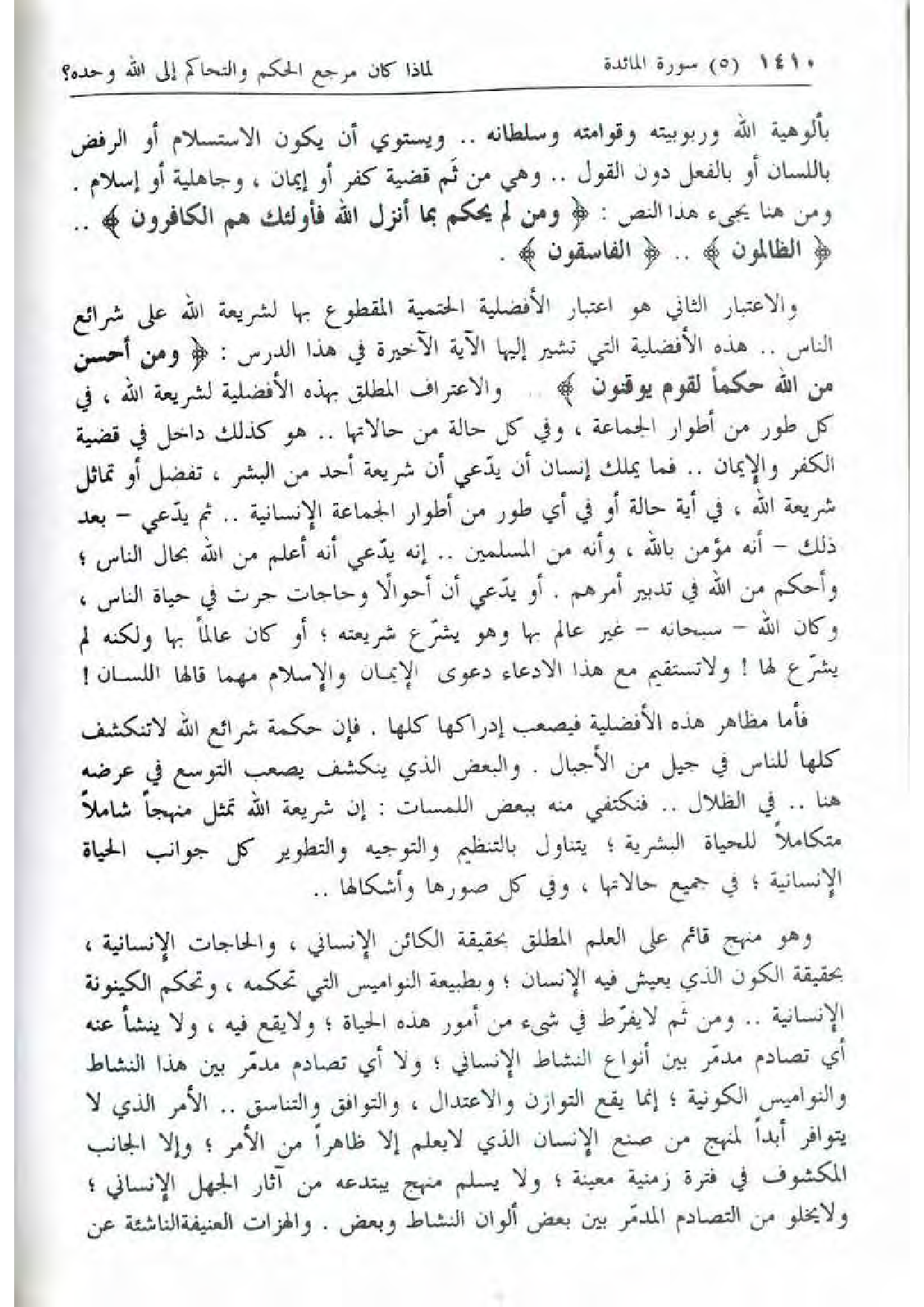 والاعتبار الثاني هو اعتبار الأفضلية الحتمية المقطوع بها لشريعة الله على شرائع الناس .. هذه الأفضلية التي تشير إليها الآية الأخيرة في هذا الدرس: وَمَنْ أَحْسَنُ مِنَ اللَّهِ حُكْماً لِقَوْمٍ يُوقِنُونَ .. والاعتراف المطلق بهذه الأفضلية لشريعة الله، في كل طور من أطوار الجماعة، وفي كل حالة من حالاتها .. هو كذلك داخل في قضية الكفر والإيمان .. فما يملك إنسان أن يدّعي أن شريعة أحد من البشر، تفضل أو تماثل شريعة الله، في أية حالة أو في أي طور من أطوار الجماعة الإنسانية .. ثم يدّعي- بعد ذلك- أنه مؤمن بالله، وأنه من المسلمين .. إنه يدّعي أنه أعلم من الله بحال الناس؛ وأحكم من الله في تدبير أمرهم. أو يدّعي أن أحوالا وحاجات جرت في حياة الناس، وكان الله- سبحانه- غير عالم بها وهو يشرّع شريعته؛ أو كان عالما بها ولكنه لم يشرّع لها! ولا تستقيم مع هذا الادعاء دعوى الإيمان والإسلام مهما قالها اللسان!