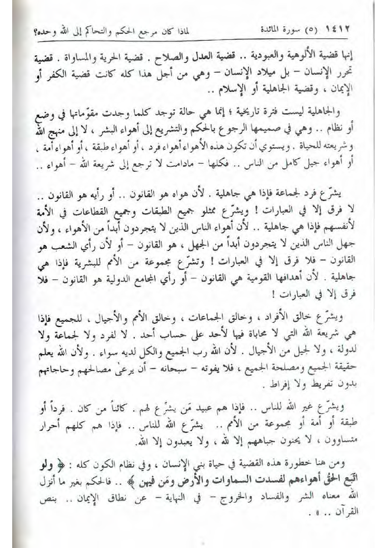 ومن هنا خطورة هذه القضية في حياة بني الإنسان، وفي نظام الكون كله: وَلَوِ اتَّبَعَ الْحَقُّ أَهْواءَهُمْ لَفَسَدَتِ السَّماواتُ وَالْأَرْضُ وَمَنْ فِيهِنَّ .. فالحكم بغير ما أنزل الله معناه الشر والفساد والخروج- في النهاية- عن نطاق الإيمان .. بنص القرآن .. ».