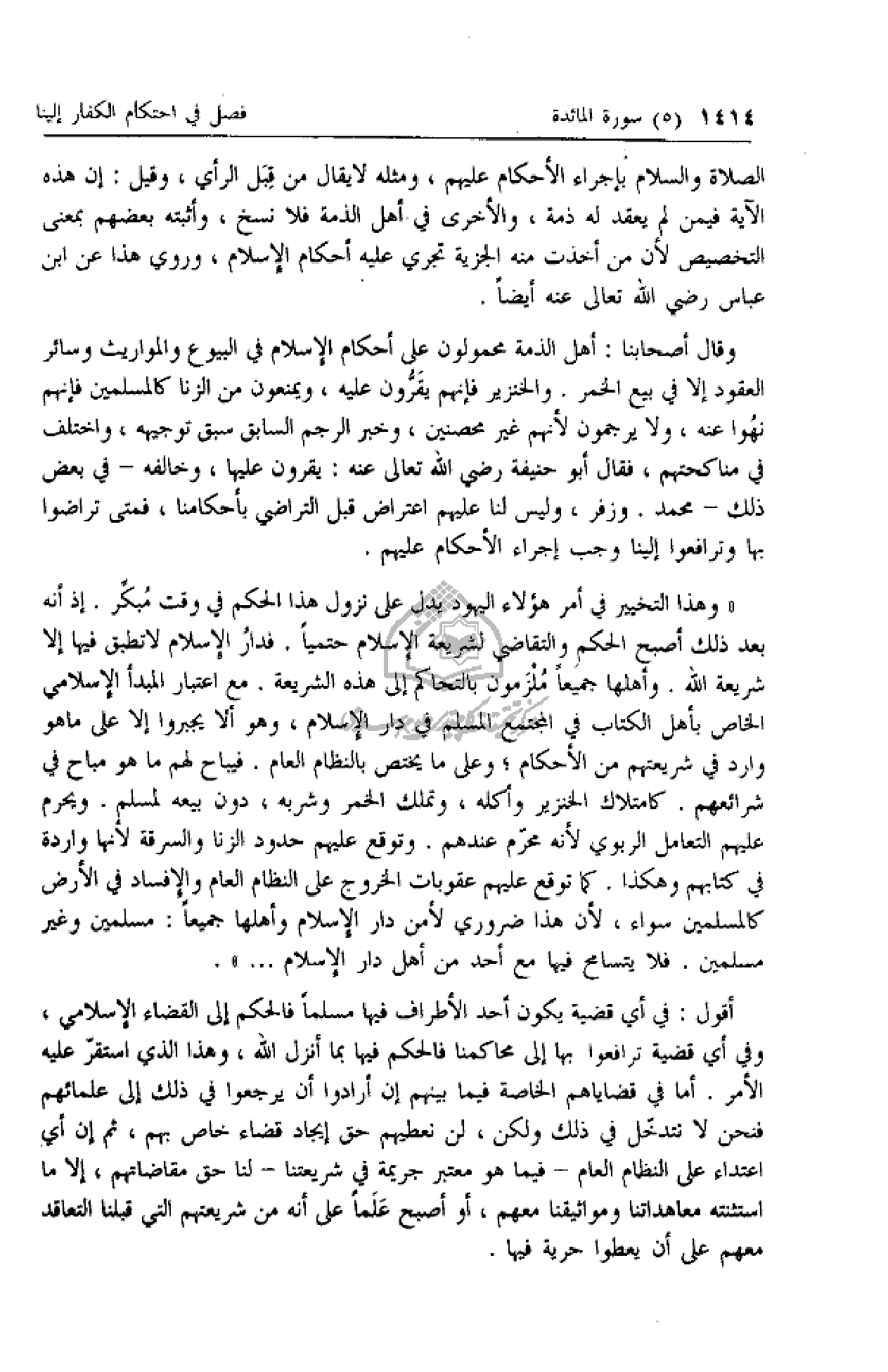 «وهذا التخيير في أمر هؤلاء اليهود يدل على نزول هذا الحكم في وقت مبكّر. إذ أنه بعد ذلك أصبح الحكم والتقاضي لشريعة الإسلام حتميا. فدار الإسلام لا تطبق فيها إلا شريعة الله. وأهلها جميعا ملزمون بالتحاكم إلى هذه الشريعة. مع اعتبار المبدأ الإسلامي الخاص بأهل الكتاب في المجتمع المسلم في دار الإسلام، وهو ألا يجبروا إلا على ما هو وارد في شريعتهم من الأحكام؛ وعلى ما يختص بالنظام العام. فيباح لهم ما هو مباح في شرائعهم. كامتلاك الخنزير وأكله، وتملك الخمر وشربه، دون بيعه لمسلم. ويحرم عليهم التعامل الربوي لأنه محرّم عندهم. وتوقع عليهم حدود الزنا والسرقة لأنها واردة في كتابهم وهكذا. كما توقع عليهم عقوبات الخروج على النظام العام والإفساد في الأرض كالمسلمين سواء، لأن هذا ضروري لأمن دار الإسلام وأهلها جميعا: مسلمين وغير مسلمين. فلا يتسامح فيها مع أحد من أهل دار الإسلام ... ».