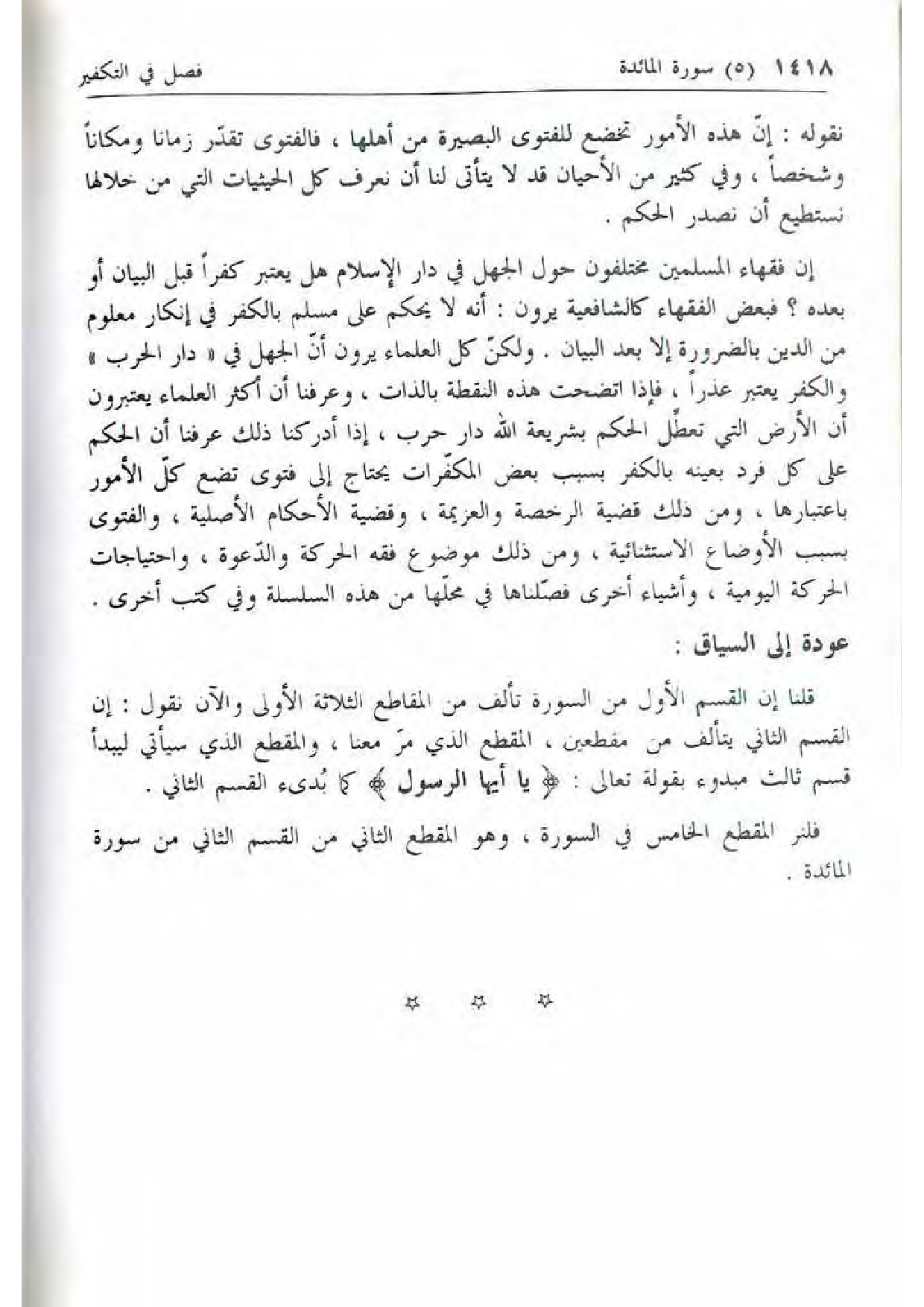إن فقهاء المسلمين مختلفون حول الجهل في دار الإسلام هل يعتبر كفرا قبل البيان أو بعده؟ فبعض الفقهاء كالشافعية يرون: أنه لا يحكم على مسلم بالكفر في إنكار معلوم من الدين بالضرورة إلا بعد البيان. ولكنّ كل العلماء يرون أنّ الجهل في «دار الحرب» والكفر يعتبر عذرا، فإذا اتضحت هذه النقطة بالذات، وعرفنا أن أكثر العلماء يعتبرون أن الأرض التي تعطّل الحكم بشريعة الله دار حرب، إذا أدركنا ذلك عرفنا أن الحكم على كل فرد بعينه بالكفر بسبب بعض المكفّرات يحتاج إلى فتوى تضع كلّ الأمور باعتبارها، ومن ذلك قضية الرخصة والعزيمة، وقضية الأحكام الأصلية، والفتوى بسبب الأوضاع الاستثنائية، ومن ذلك موضوع فقه الحركة والدّعوة، واحتياجات الحركة اليومية، وأشياء أخرى فصّلناها في محلّها من هذه السلسلة وفي كتب أخرى.