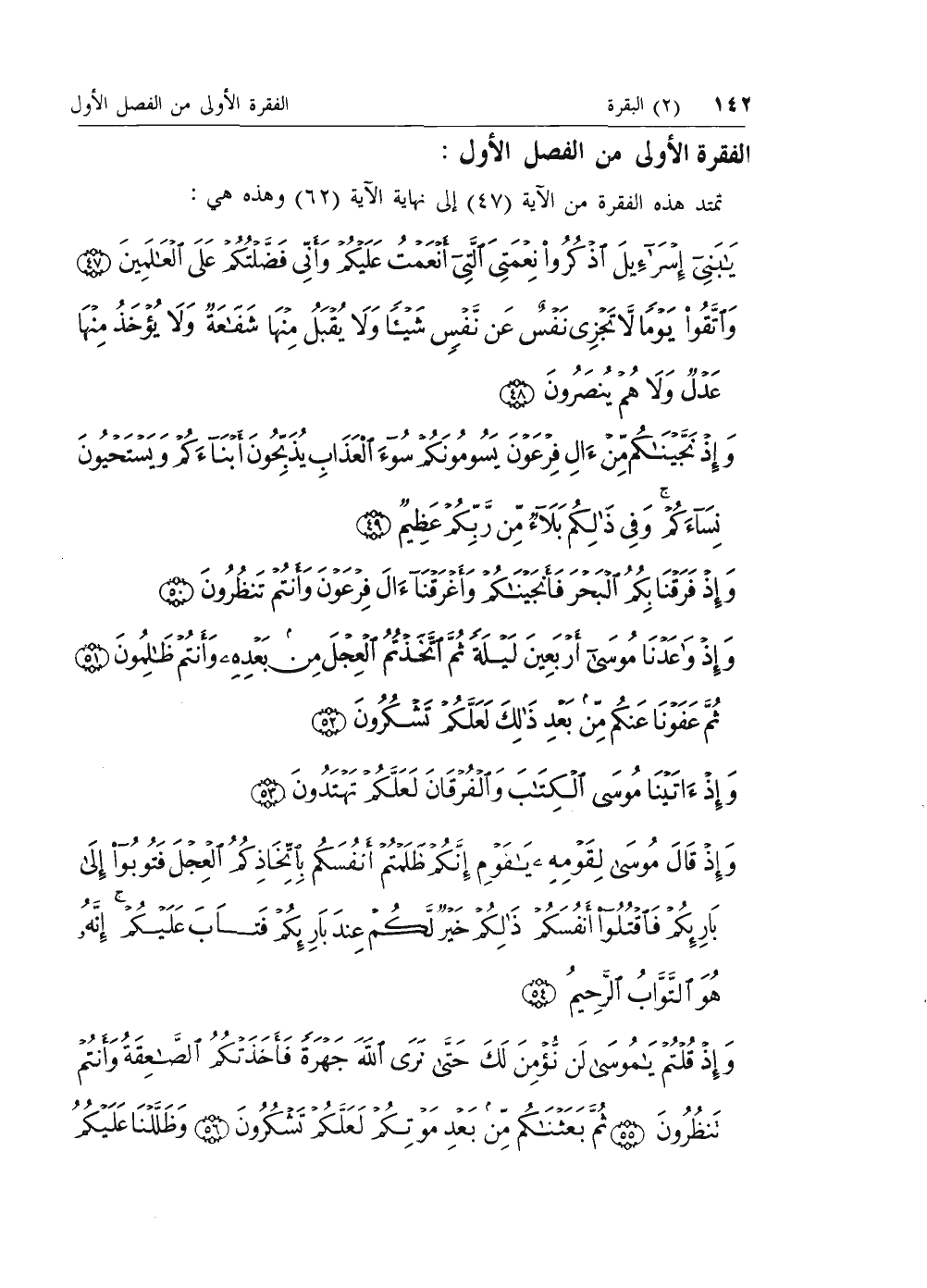 يا بَنِي إِسْرائِيلَ اذْكُرُوا نِعْمَتِيَ الَّتِي أَنْعَمْتُ عَلَيْكُمْ وَأَنِّي فَضَّلْتُكُمْ عَلَى الْعالَمِينَ (47) وَاتَّقُوا يَوْماً لا تَجْزِي نَفْسٌ عَنْ نَفْسٍ شَيْئاً وَلا يُقْبَلُ مِنْها شَفاعَةٌ وَلا يُؤْخَذُ مِنْها عَدْلٌ وَلا هُمْ يُنْصَرُونَ (48) وَإِذْ نَجَّيْناكُمْ مِنْ آلِ فِرْعَوْنَ يَسُومُونَكُمْ سُوءَ الْعَذابِ يُذَبِّحُونَ أَبْناءَكُمْ وَيَسْتَحْيُونَ نِساءَكُمْ وَفِي ذلِكُمْ بَلاءٌ مِنْ رَبِّكُمْ عَظِيمٌ (49) وَإِذْ فَرَقْنا بِكُمُ الْبَحْرَ فَأَنْجَيْناكُمْ وَأَغْرَقْنا آلَ فِرْعَوْنَ وَأَنْتُمْ تَنْظُرُونَ (50) وَإِذْ واعَدْنا مُوسى أَرْبَعِينَ لَيْلَةً ثُمَّ اتَّخَذْتُمُ الْعِجْلَ مِنْ بَعْدِهِ وَأَنْتُمْ ظالِمُونَ (51)