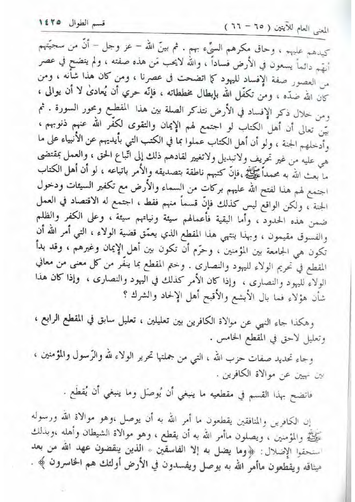 كيدهم عليهم، وحاق مكرهم السيئ بهم. ثم بيّن الله- عزّ وجل- أنّ من سجيّتهم أنّهم دائما يسعون في الأرض فسادا، والله لا يحب من هذه صفته، ولم يتضح في عصر من العصور صفة الإفساد لليهود كما اتضحت في عصرنا، ومن كان هذا شأنه، ومن كان الله ضدّه، ومن تكفّل الله بإبطال مخططاته، فإنّه حري أن يعادى لا أن يوالى، ومن خلال ذكر الإفساد في الأرض نتذكر الصلة بين هذا المقطع ومحور السورة. ثم بيّن تعالى أن أهل الكتاب لو اجتمع لهم الإيمان والتقوى لكفّر الله عنهم ذنوبهم، وأدخلهم الجنة، ولو أن أهل الكتاب عملوا بما في الكتب التي بأيديهم عن الأنبياء على ما هي عليه من غير تحريف ولا تبديل ولا تغيير لقادهم ذلك إلى اتّباع الحق، والعمل بمقتضى ما بعث الله به محمدا صلّى الله عليه وسلّم، فإنّ كتبهم ناطقة بتصديقه والأمر باتباعه، لو أن أهل الكتاب اجتمع لهم هذا لفتح الله عليهم بركات من السماء والأرض مع تكفير السيئات ودخول الجنة، ولكن الواقع ليس كذلك فإنّ قسما منهم فقط، اجتمع له الاقتصاد في العمل ضمن هذه الحدود، وأما البقية فأعمالهم سيئة ونياتهم سيئة، وعلى الكفر والظلم والفسوق مقيمون، وبهذا ينتهي هذا المقطع الذي يعمّق قضية الولاء، التي أمر الله أن تكون هي الجامعة بين المؤمنين، وحرّم أن تكون بين أهل الإيمان وغيرهم، وقد بدأ المقطع في تحريم الولاء لليهود والنصارى. وختم المقطع بما ينفّر من كل معنى من معاني الولاء لليهود والنصارى، وإذا كان الأمر كذلك في اليهود والنصارى، وإذا كان هذا شأن هؤلاء فما بال الأبشع والأقبح أهل الإلحاد والشرك؟