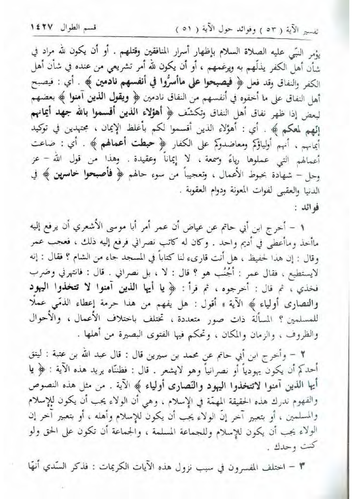 2 - وأخرج ابن أبي حاتم عن محمد بن سيرين قال: قال عبد الله بن عتبة: ليتق أحدكم أن يكون يهوديا أو نصرانيا وهو لا يشعر. قال: فظننّاه يريد هذه الآية: يا أَيُّهَا الَّذِينَ آمَنُوا لا تَتَّخِذُوا الْيَهُودَ وَالنَّصارى أَوْلِياءَ الآية. من مثل هذه النصوص والفهوم ندرك هذه الحقيقة المهمّة في الإسلام، وهي أن الولاء يجب أن يكون للإسلام والمسلمين، أو بتعبير آخر إنّ الولاء يجب أن يكون للإسلام وأهله، أو بتعبير آخر إن الولاء يجب أن يكون للإسلام وللجماعة المسلمة، والجماعة أن تكون على الحق ولو كنت وحدك.