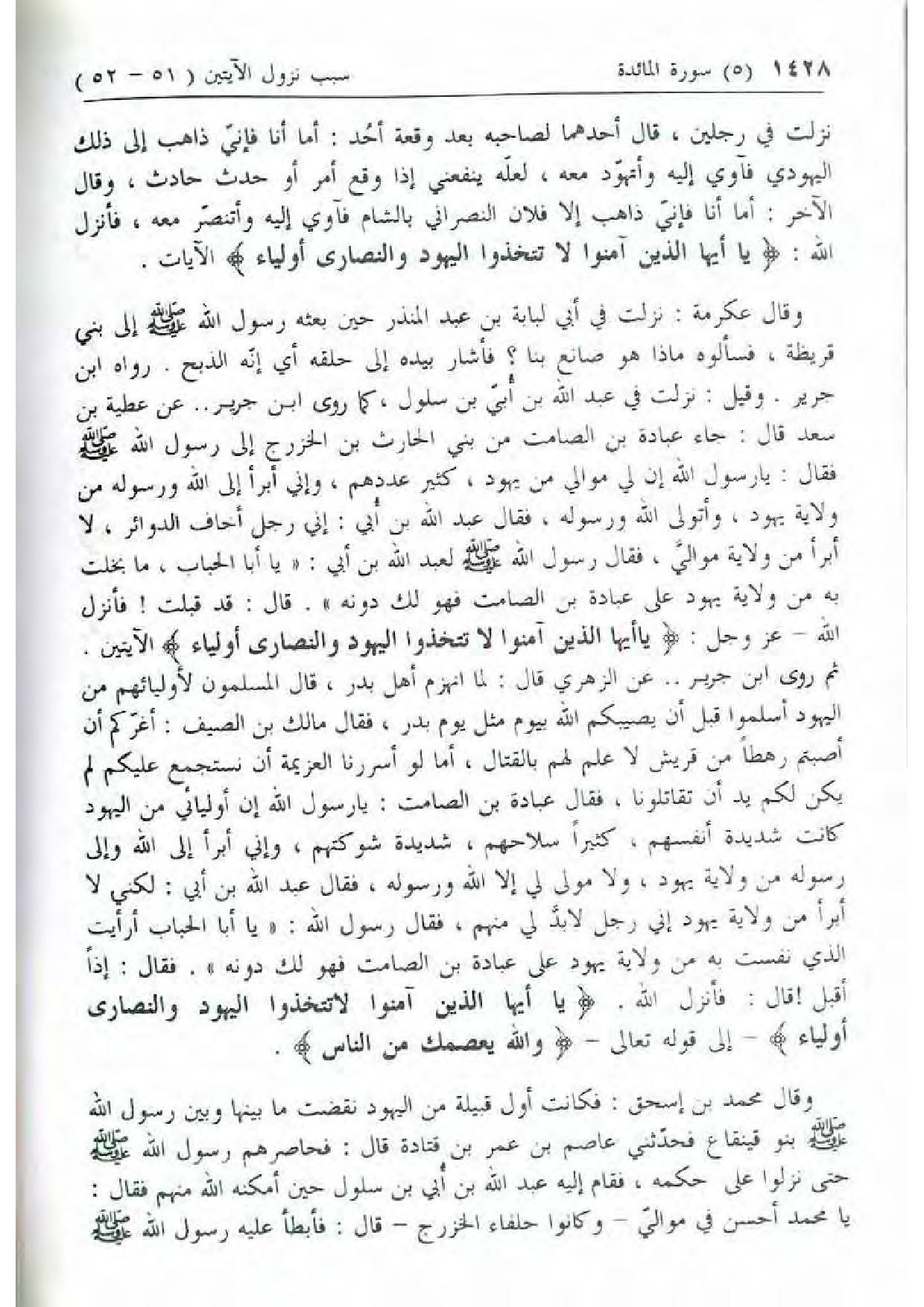 ثم روى ابن جرير .. عن الزهري قال: لما انهزم أهل بدر، قال المسلمون لأوليائهم من اليهود أسلموا قبل أن يصيبكم الله بيوم مثل يوم بدر، فقال مالك بن الصيف: أغرّكم أن أصبتم رهطا من قريش لا علم لهم بالقتال، أما لو أسررنا العزيمة أن نستجمع عليكم لم يكن لكم يد أن تقاتلونا، فقال عبادة بن الصامت: يا رسول الله إن أوليائي من اليهود كانت شديدة أنفسهم، كثيرا سلاحهم، شديدة شوكتهم، وإني أبرأ إلى الله وإلى رسوله من ولاية يهود، ولا مولى لي إلا الله ورسوله، فقال عبد الله بن أبي: لكني لا أبرأ من ولاية يهود إني رجل لا بدّ لي منهم، فقال رسول الله: «يا أبا الحباب أرأيت الذي نفست به من ولاية يهود على عبادة بن الصامت فهو لك دونه». فقال: إذا أقبل! قال: فأنزل الله. يا أَيُّهَا الَّذِينَ آمَنُوا لا تَتَّخِذُوا الْيَهُودَ وَالنَّصارى أَوْلِياءَ- إلى قوله تعالى- وَاللَّهُ يَعْصِمُكَ مِنَ النَّاسِ.