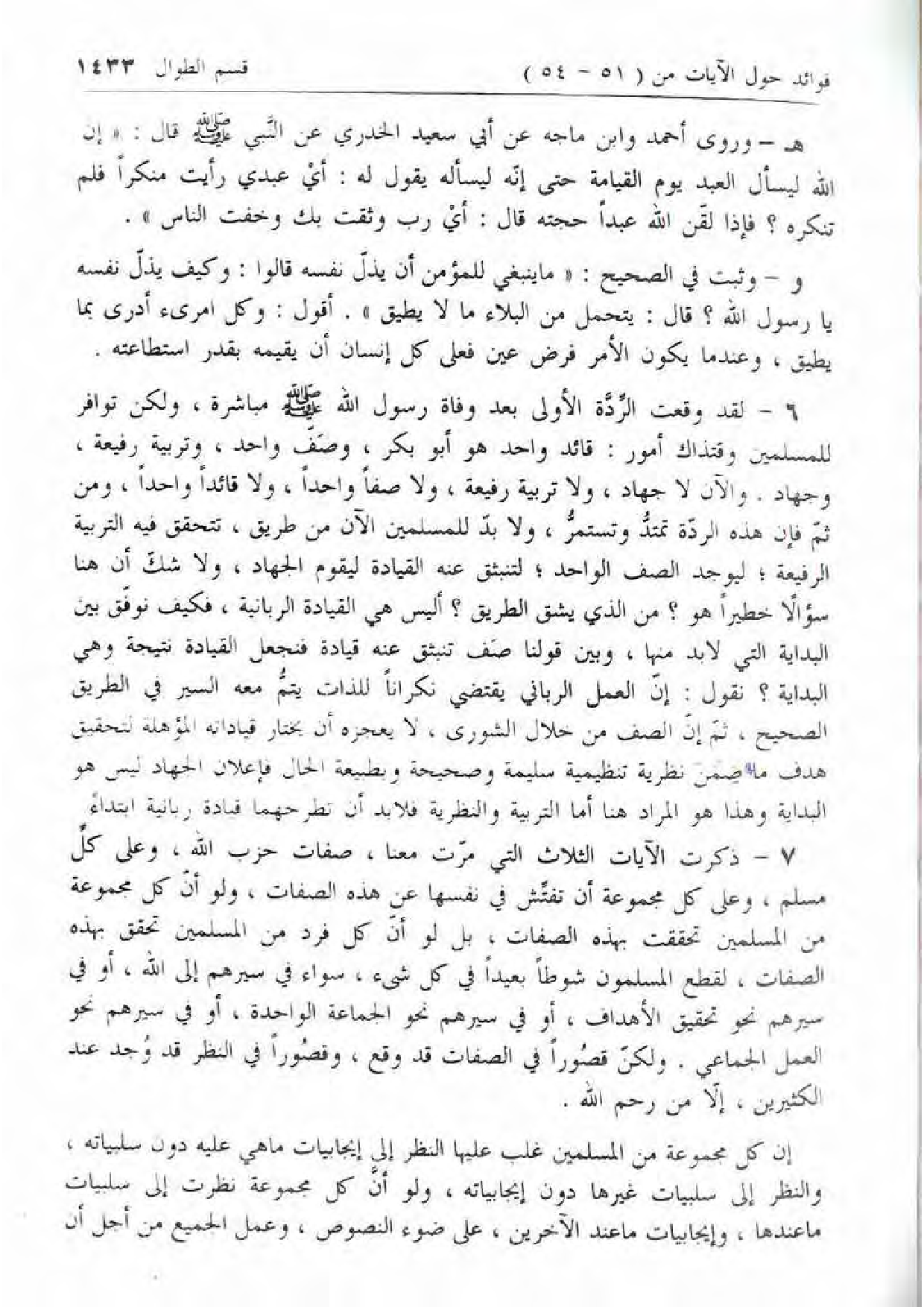 لقد وقعت الرّدّة الأولى بعد وفاة رسول الله صلّى الله عليه وسلّم مباشرة، ولكن توافر للمسلمين وقتذاك أمور: قائد واحد هو أبو بكر، وصفّ واحد، وتربية رفيعة، وجهاد. والآن لا جهاد، ولا تربية رفيعة، ولا صفا واحدا، ولا قائدا واحدا، ومن ثمّ فإن هذه الردّة تمتدّ وتستمرّ، ولا بدّ للمسلمين الآن من طريق، تتحقق فيه التربية الرفيعة؛ ليوجد الصف الواحد؛ لتنبثق عنه القيادة ليقوم الجهاد، ولا شكّ أن هنا سؤالا خطيرا هو؟ من الذي يشق الطريق؟ أليس هي القيادة الربانية، فكيف نوفّق بين البداية التي لا بد منها، وبين قولنا صف تنبثق عنه قيادة فنجعل القيادة نتيجة وهي البداية؟ نقول: إنّ العمل الرباني يقتضي نكرانا للذات يتمّ معه السير في الطريق الصحيح، ثمّ إنّ الصف من خلال الشورى، لا يعجزه أن يختار قياداته المؤهلة لتحقيق هدف ما ضمن نظرية تنظيمية سليمة وصحيحة وبطبيعة الحال فإعلان الجهاد ليس هو البداية وهذا هو المراد هنا أما التربية والنظرية فلا بد أن تطرحهما قيادة ربانية ابتداء.