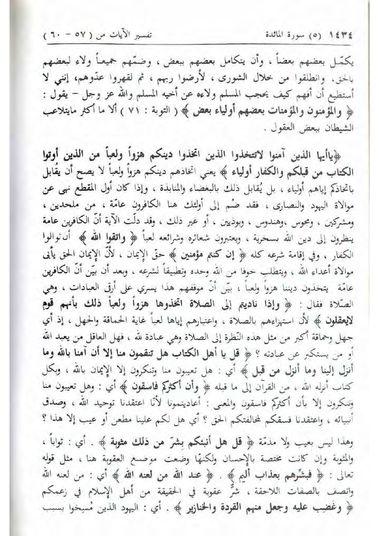 يا أَيُّهَا الَّذِينَ آمَنُوا لا تَتَّخِذُوا الَّذِينَ اتَّخَذُوا دِينَكُمْ هُزُواً وَلَعِباً مِنَ الَّذِينَ أُوتُوا الْكِتابَ مِنْ قَبْلِكُمْ وَالْكُفَّارَ أَوْلِياءَ يعني اتخاذهم دينكم هزوا ولعبا لا يصح أن يقابل باتخاذكم إياهم أولياء، بل يقابل ذلك بالبغضاء والمنابذة، وإذا كان أول المقطع نهى عن موالاة اليهود والنصارى، فقد ضم إلى أولئك هنا الكافرون عامّة، من ملحدين، ومشركين، ومجوس، وهندوس، وبوذيين، أو غير ذلك، وقد دلّت الآية أنّ الكافرين عامة ينظرون إلى دين الله بسخرية، ويعتبرون شعائره وشرائعه لعبا وَاتَّقُوا اللَّهَ أن توالوا الكفار، وفي إقامة شرعه كله إِنْ كُنْتُمْ مُؤْمِنِينَ حقّ الإيمان، لأنّ الإيمان الحق يأبى موالاة أعداء الله، ويتطلب خوفا من الله وحده وتطبيقا لشرعه،