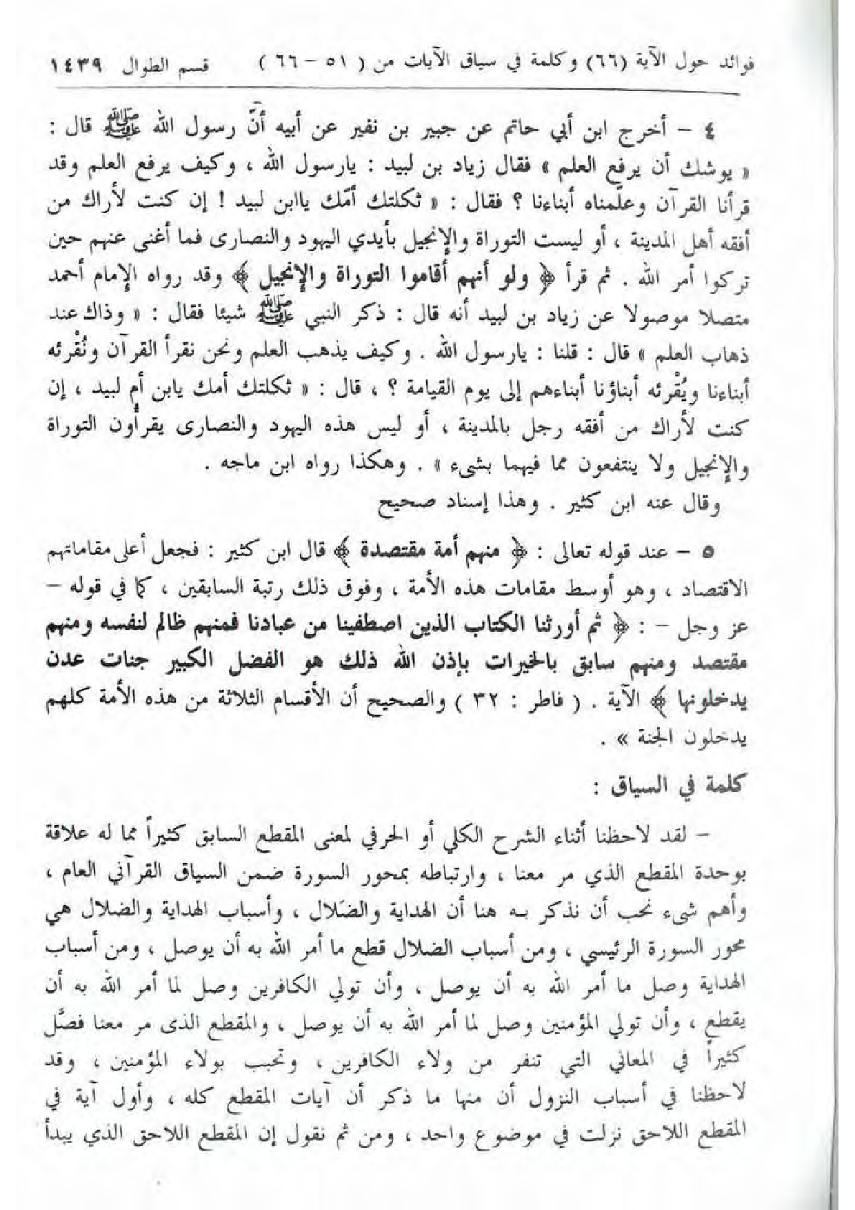 5 - عند قوله تعالى: مِنْهُمْ أُمَّةٌ مُقْتَصِدَةٌ قال ابن كثير: فجعل أعلى مقاماتهم الاقتصاد، وهو أوسط مقامات هذه الأمة، وفوق ذلك رتبة السابقين، كما في قوله- عزّ وجل-: ثُمَّ أَوْرَثْنَا الْكِتابَ الَّذِينَ اصْطَفَيْنا مِنْ عِبادِنا فَمِنْهُمْ ظالِمٌ لِنَفْسِهِ وَمِنْهُمْ مُقْتَصِدٌ وَمِنْهُمْ سابِقٌ بِالْخَيْراتِ بِإِذْنِ اللَّهِ ذلِكَ هُوَ الْفَضْلُ الْكَبِيرُ جَنَّاتُ عَدْنٍ يَدْخُلُونَها الآية. (فاطر: 32) والصحيح أن الأقسام الثلاثة من هذه الأمة كلهم يدخلون الجنة».