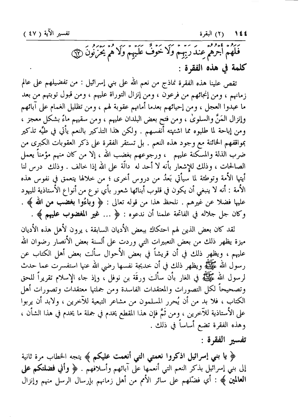 يا بَنِي إِسْرائِيلَ اذْكُرُوا نِعْمَتِيَ الَّتِي أَنْعَمْتُ عَلَيْكُمْ يتجه الخطاب مرة ثانية إلى بني إسرائيل بذكر النعم التي أنعمها على آبائهم وأسلافهم. وَأَنِّي فَضَّلْتُكُمْ عَلَى الْعالَمِينَ: أي فضلهم على سائر الأمم من أهل زمانهم بإرسال الرسل منهم وإنزال