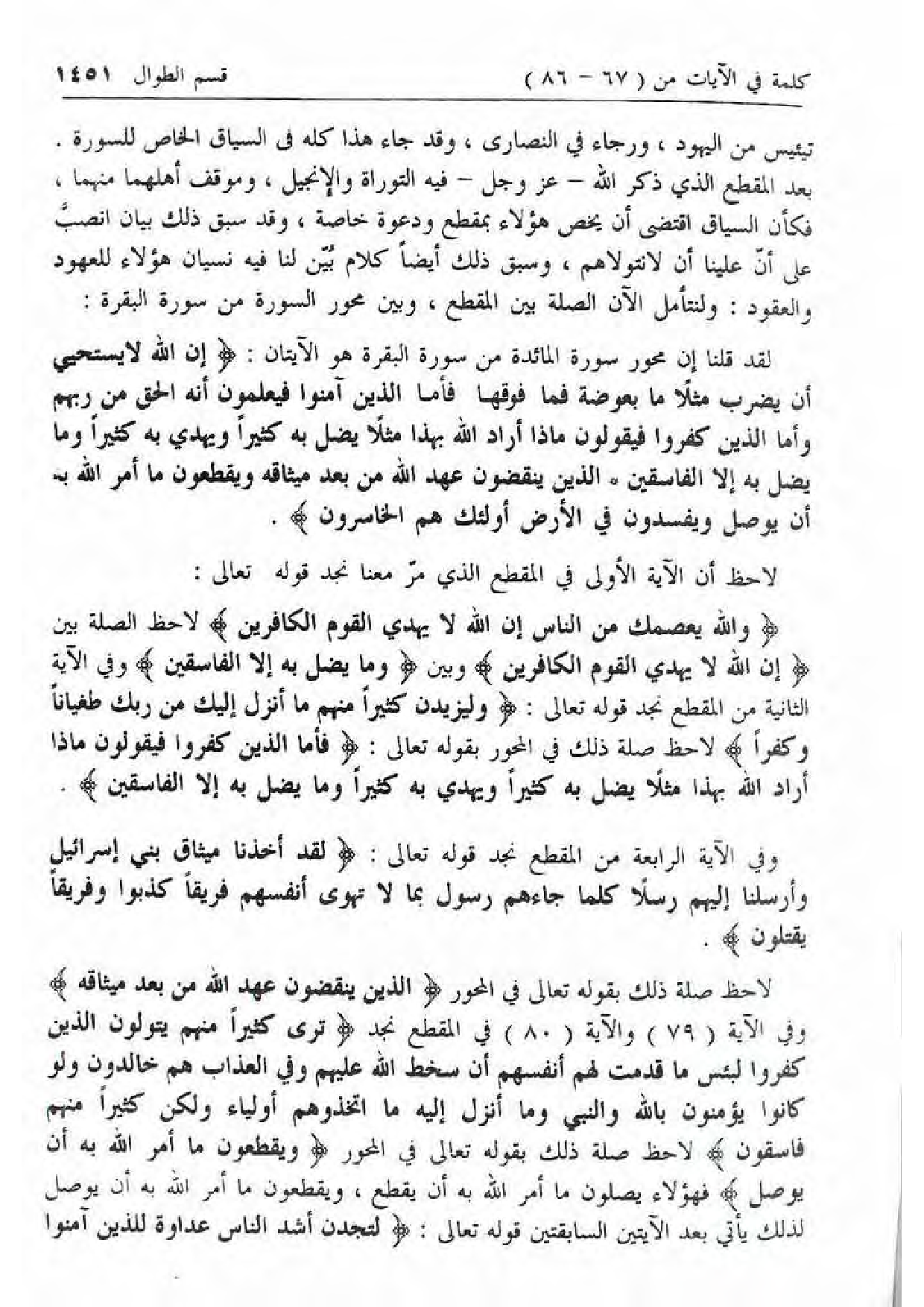 وَاللَّهُ يَعْصِمُكَ مِنَ النَّاسِ إِنَّ اللَّهَ لا يَهْدِي الْقَوْمَ الْكافِرِينَ لاحظ الصلة بين إِنَّ اللَّهَ لا يَهْدِي الْقَوْمَ الْكافِرِينَ وبين وَما يُضِلُّ بِهِ إِلَّا الْفاسِقِينَ وفي الآية الثانية من المقطع نجد قوله تعالى: وَلَيَزِيدَنَّ كَثِيراً مِنْهُمْ ما أُنْزِلَ إِلَيْكَ مِنْ رَبِّكَ طُغْياناً وَكُفْراً لاحظ صلة ذلك في المحور بقوله تعالى: وَأَمَّا الَّذِينَ كَفَرُوا فَيَقُولُونَ ماذا أَرادَ اللَّهُ بِهذا مَثَلًا يُضِلُّ بِهِ كَثِيراً وَيَهْدِي بِهِ كَثِيراً وَما يُضِلُّ بِهِ إِلَّا الْفاسِقِينَ.