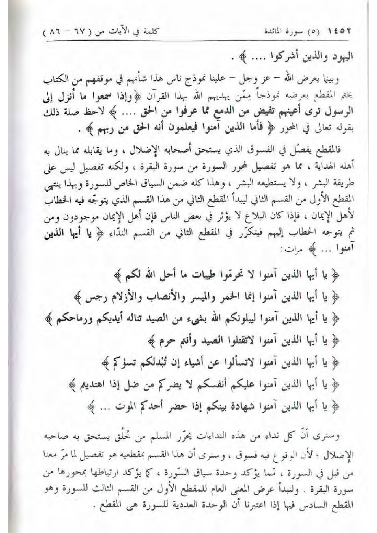 يا أَيُّهَا الَّذِينَ آمَنُوا لا تَسْئَلُوا عَنْ أَشْياءَ إِنْ تُبْدَ لَكُمْ تَسُؤْكُمْ يا أَيُّهَا الَّذِينَ آمَنُوا عَلَيْكُمْ أَنْفُسَكُمْ لا يَضُرُّكُمْ مَنْ ضَلَّ إِذَا اهْتَدَيْتُمْ
