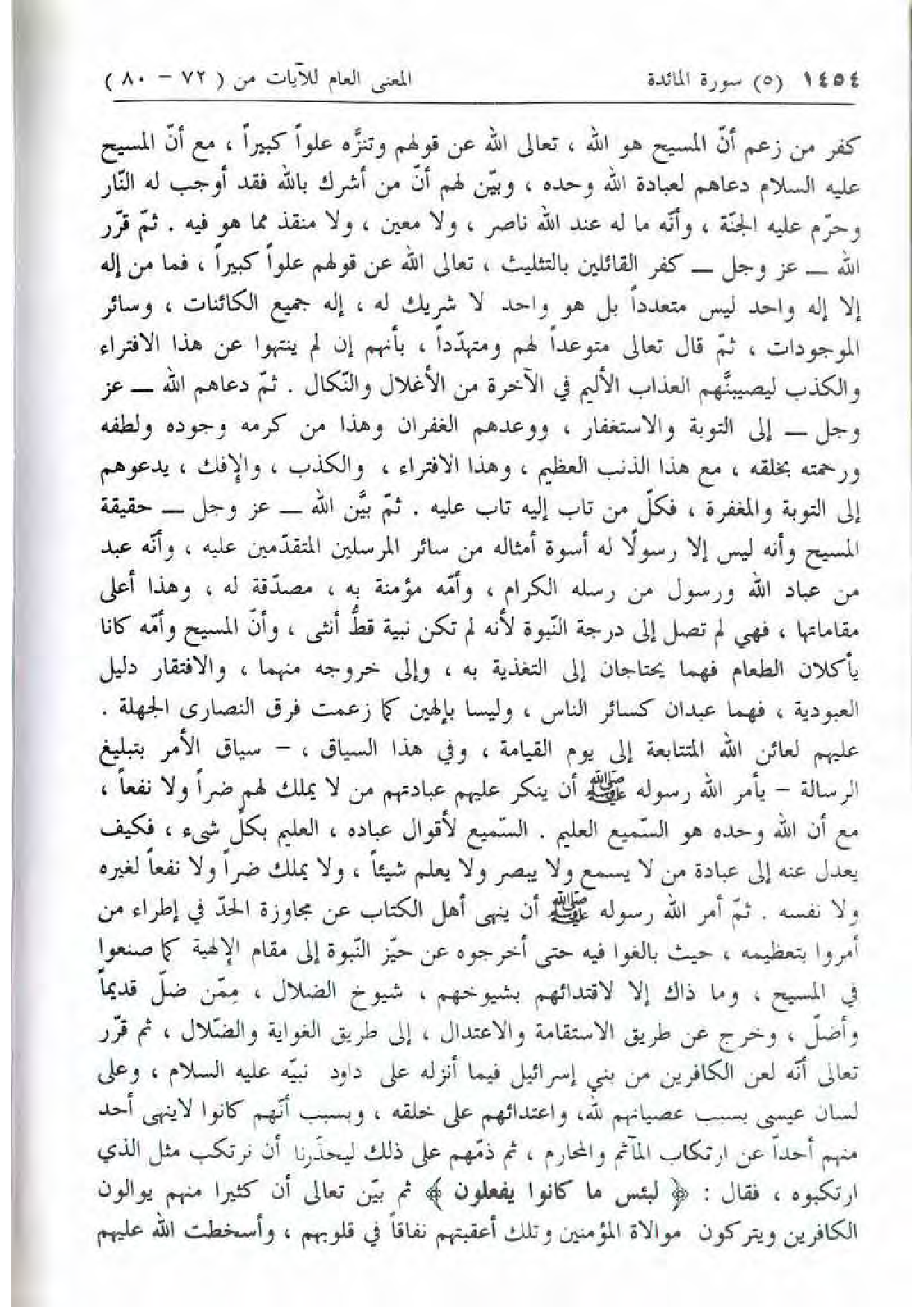 كفر من زعم أنّ المسيح هو الله، تعالى الله عن قولهم وتنزّه علوا كبيرا، مع أنّ المسيح عليه السلام دعاهم لعبادة الله وحده، وبيّن لهم أنّ من أشرك بالله فقد أوجب له النّار وحرّم عليه الجنّة، وأنّه ما له عند الله ناصر، ولا معين، ولا منقذ مما هو فيه. ثمّ قرّر الله- عزّ وجل- كفر القائلين بالتثليث، تعالى الله عن قولهم علوا كبيرا، فما من إله إلا إله واحد ليس متعددا بل هو واحد لا شريك له، إله جميع الكائنات، وسائر الموجودات، ثمّ قال تعالى متوعدا لهم ومتهدّدا، بأنهم إن لم ينتهوا عن هذا الافتراء والكذب ليصيبنّهم العذاب الأليم في الآخرة من الأغلال والنّكال. ثمّ دعاهم الله- عزّ وجل- إلى التوبة والاستغفار، ووعدهم الغفران وهذا من كرمه وجوده ولطفه ورحمته بخلقه، مع هذا الذنب العظيم، وهذا الافتراء، والكذب، والإفك، يدعوهم إلى التوبة والمغفرة، فكلّ من تاب إليه تاب عليه. ثمّ بيّن الله- عزّ وجل- حقيقة المسيح وأنه ليس إلا رسولا له أسوة أمثاله من سائر المرسلين المتقدّمين عليه، وأنّه عبد من عباد الله ورسول من رسله الكرام، وأمّه مؤمنة به، مصدّقة له، وهذا أعلى مقاماتها، فهي لم تصل إلى درجة النّبوة لأنه لم تكن نبية قطّ أنثى، وأنّ المسيح وأمّه كانا يأكلان الطعام فهما يحتاجان إلى التغذية به، وإلى خروجه منهما، والافتقار دليل العبودية، فهما عبدان كسائر الناس، وليسا بإلهين كما زعمت فرق النصارى الجهلة.