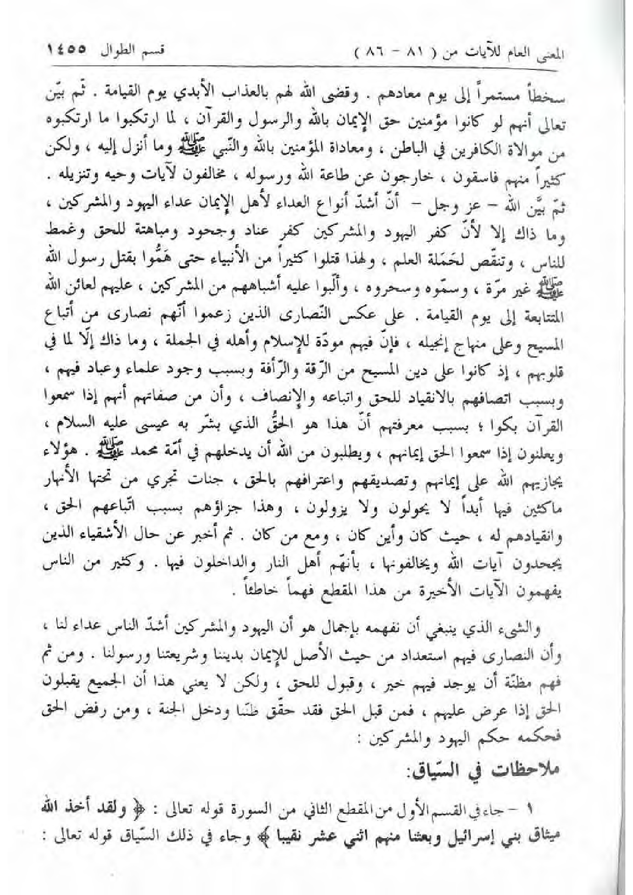ثمّ بيّن الله- عزّ وجل- أنّ أشدّ أنواع العداء لأهل الإيمان عداء اليهود والمشركين، وما ذاك إلا لأنّ كفر اليهود والمشركين كفر عناد وجحود ومباهتة للحق وغمط للناس، وتنقّص لحملة العلم، ولهذا قتلوا كثيرا من الأنبياء حتى همّوا بقتل رسول الله صلّى الله عليه وسلّم غير مرّة، وسمّوه وسحروه، وألّبوا عليه أشباههم من المشركين، عليهم لعائن الله المتتابعة إلى يوم القيامة. على عكس النّصارى الذين زعموا أنّهم نصارى من أتباع المسيح وعلى منهاج إنجيله، فإنّ فيهم مودّة للإسلام وأهله في الجملة، وما ذاك إلّا لما في قلوبهم، إذ كانوا على دين المسيح من الرّقة والرّأفة وبسبب وجود علماء وعباد فيهم، وبسبب اتصافهم بالانقياد للحق واتباعه والإنصاف، وأن من صفاتهم أنهم إذا سمعوا القرآن بكوا؛ بسبب معرفتهم أنّ هذا هو الحقّ الذي بشّر به عيسى عليه السلام، ويعلنون إذا سمعوا الحق إيمانهم، ويطلبون من الله أن يدخلهم في أمّة محمد صلّى الله عليه وسلّم. هؤلاء يجازيهم الله على إيمانهم وتصديقهم واعترافهم بالحق، جنات تجري من تحتها الأنهار ماكثين فيها أبدا لا يحولون ولا يزولون، وهذا جزاؤهم بسبب اتّباعهم الحق، وانقيادهم له، حيث كان وأين كان، ومع من كان. ثم أخبر عن حال الأشقياء الذين يجحدون آيات الله ويخالفونها، بأنّهم أهل النار والداخلون فيها. وكثير من الناس يفهمون الآيات الأخيرة من هذا المقطع فهما خاطئا.
