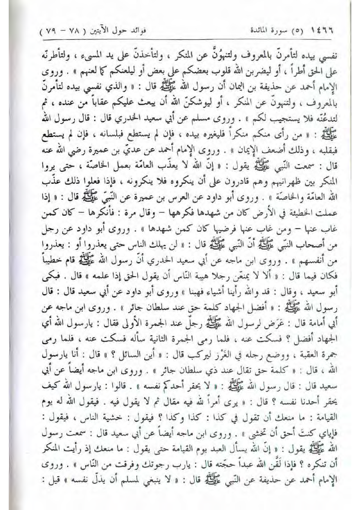 نفسي بيده لتأمرنّ بالمعروف ولتنهونّ عن المنكر، ولتأخذنّ على يد المسئ، ولتأطرنّه على الحق أطرا، أو ليضربن الله قلوب بعضكم على بعض أو ليلعنكم كما لعنهم». وروى الإمام أحمد عن حذيفة بن اليمان أن رسول الله صلّى الله عليه وسلّم قال: «والذي نفسي بيده لتأمرنّ بالمعروف، ولتنهونّ عن المنكر، أو ليوشكنّ الله أن يبعث عليكم عقابا من عنده، ثم لتدعنّه فلا يستجيب لكم». وروى مسلم عن أبي سعيد الخدري قال: قال رسول الله صلّى الله عليه وسلّم: «من رأى منكم منكرا فليغيره بيده، فإن
