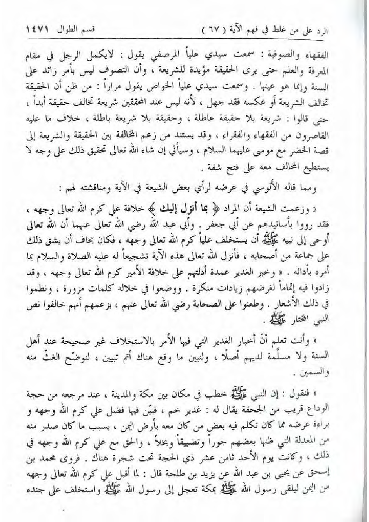 «وزعمت الشيعة أن المراد ب ما أُنْزِلَ إِلَيْكَ خلافة علي كرم الله تعالى وجهه، فقد رووا بأسانيدهم عن أبي جعفر. وأبي عبد الله رضي الله تعالى عنهما أن الله تعالى أوحى إلى نبيه صلّى الله عليه وسلّم أن يستخلف عليا كرم الله تعالى وجهه، فكان يخاف أن يشق ذلك على جماعة من أصحابه، فأنزل الله تعالى هذه الآية تشجيعا له عليه الصلاة والسلام بما أمره بأدائه. «وخبر الغدير عمدة أدلتهم على خلافة الأمير كرم الله تعالى وجهه، وقد زادوا فيه إتماما لغرضهم زيادات منكرة. ووضعوا في خلاله كلمات مزورة، ونظموا في ذلك الأشعار. وطعنوا على الصحابة رضي الله تعالى عنهم، بزعمهم أنهم خالفوا نص النبي المختار صلّى الله عليه وسلّم.