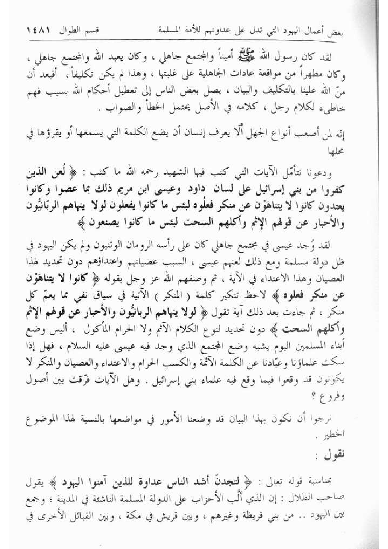 ودعونا نتأمّل الآيات التي كتب فيها الشهيد رحمه الله ما كتب: لُعِنَ الَّذِينَ كَفَرُوا مِنْ بَنِي إِسْرائِيلَ عَلى لِسانِ داوُدَ وَعِيسَى ابْنِ مَرْيَمَ ذلِكَ بِما عَصَوْا وَكانُوا يَعْتَدُونَ كانُوا لا يَتَناهَوْنَ عَنْ مُنكَرٍ فَعَلُوهُ لَبِئْسَ ما كانُوا يَفْعَلُونَ لَوْلا يَنْهاهُمُ الرَّبَّانِيُّونَ وَالْأَحْبارُ عَنْ قَوْلِهِمُ الْإِثْمَ وَأَكْلِهِمُ السُّحْتَ لَبِئْسَ ما كانُوا يَصْنَعُونَ